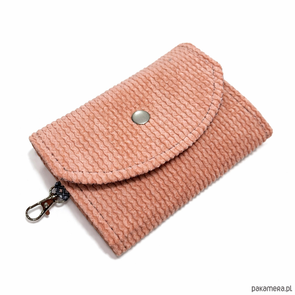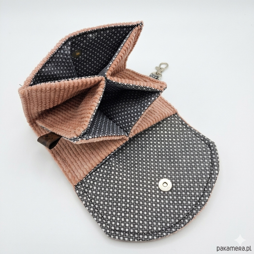 Portfelik zapina sie na zatrzask, a praktyczny karabińczyk pozwala przypiąć portfel do kluczy, szlufki spodni lub wnętrza torebki.