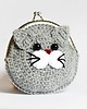 Urocza, szara portmonetka w kształcie kotka, wykonana na szydełku z bawełnianej włóczki.