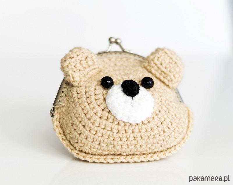 Urocza, beżowa portmonetka w kształcie misia, wykonana na szydełku z bawełnianej włóczki.