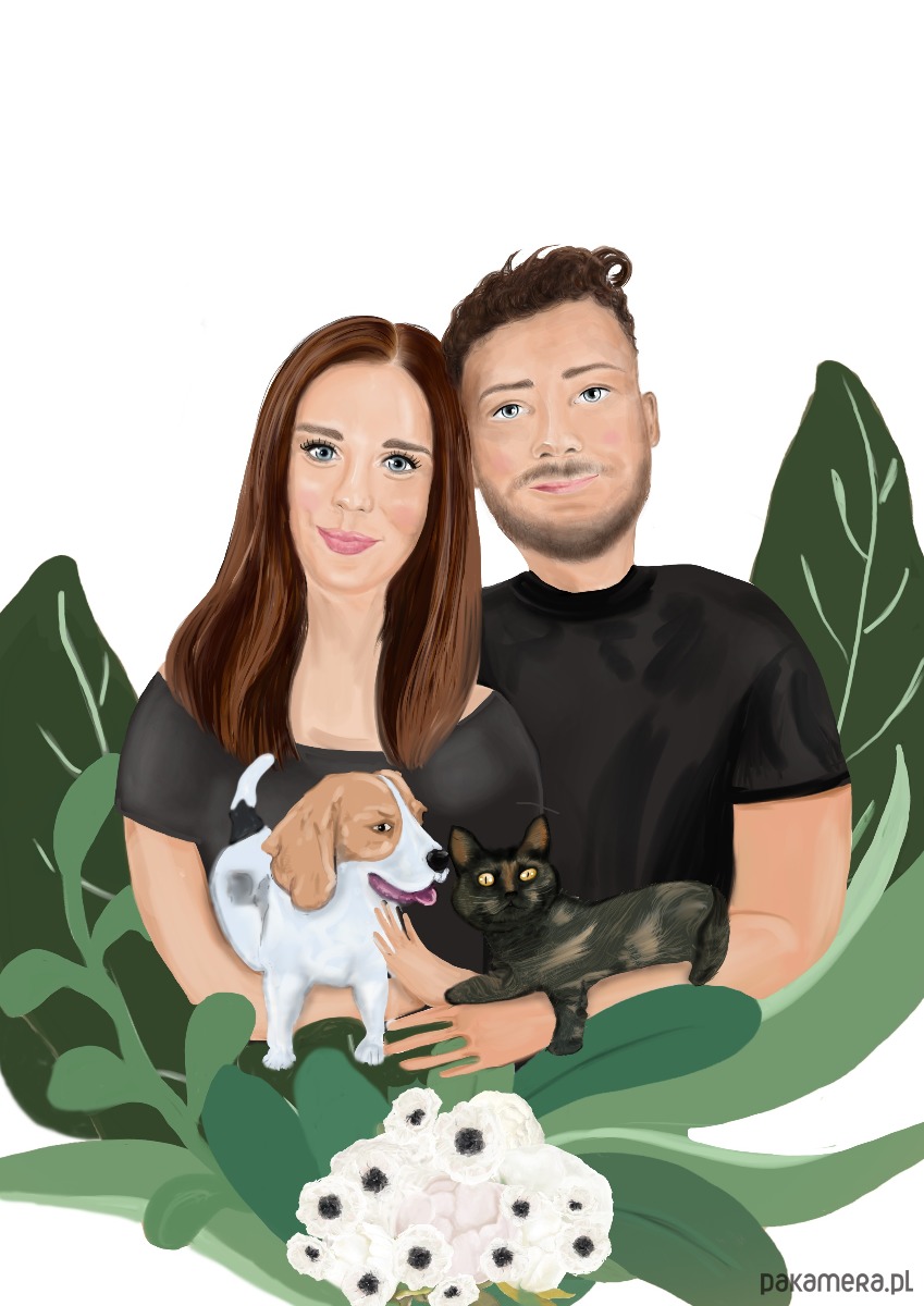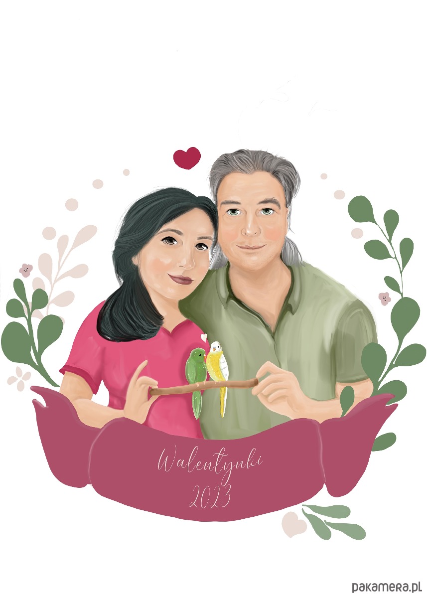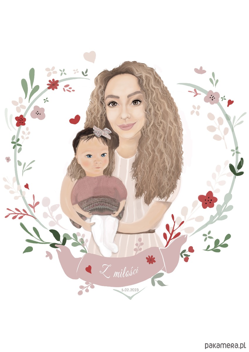 Portret w stylu bajkowym, ilustracyjnym. Wykonany metodą cyfrową. Oryginalny i miły dla oka pomysł na prezent.