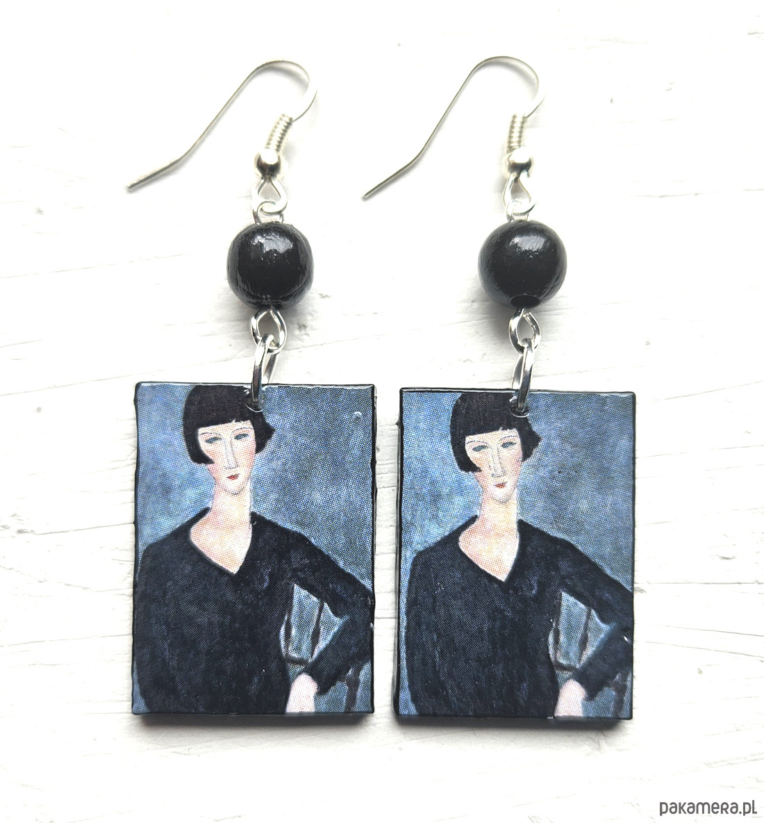 kolczyki drewniane, ozdobione metodą decoupage, dwustronne, starannie wykończone farbami akrylowymi i zabezpieczone wielokrotnie lakierem, koraliki drewniane, bigle posrebrzane, długość kolczyków bez bigli: 5 cm, szerokość: 2,2 cm, bardzo lekkie