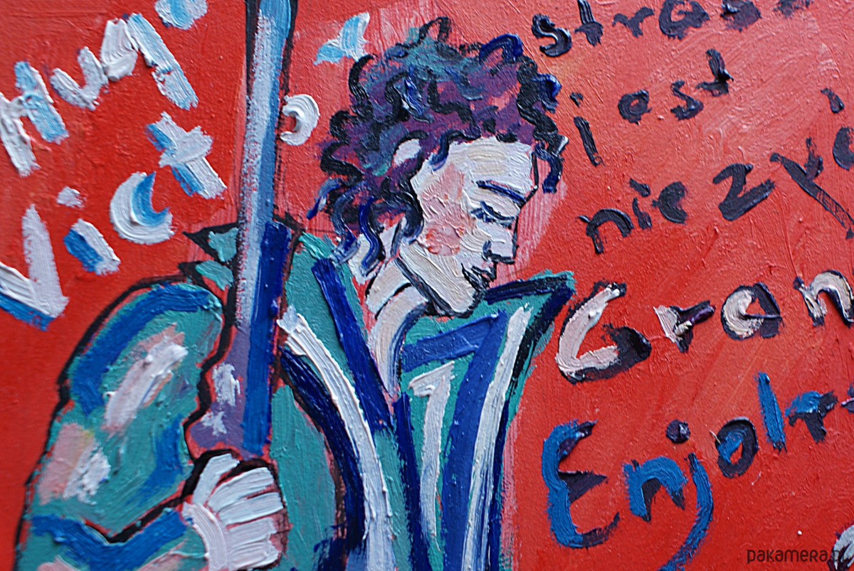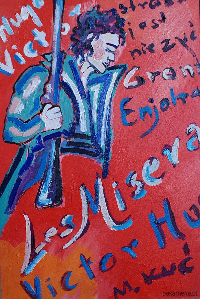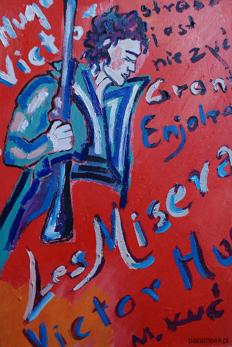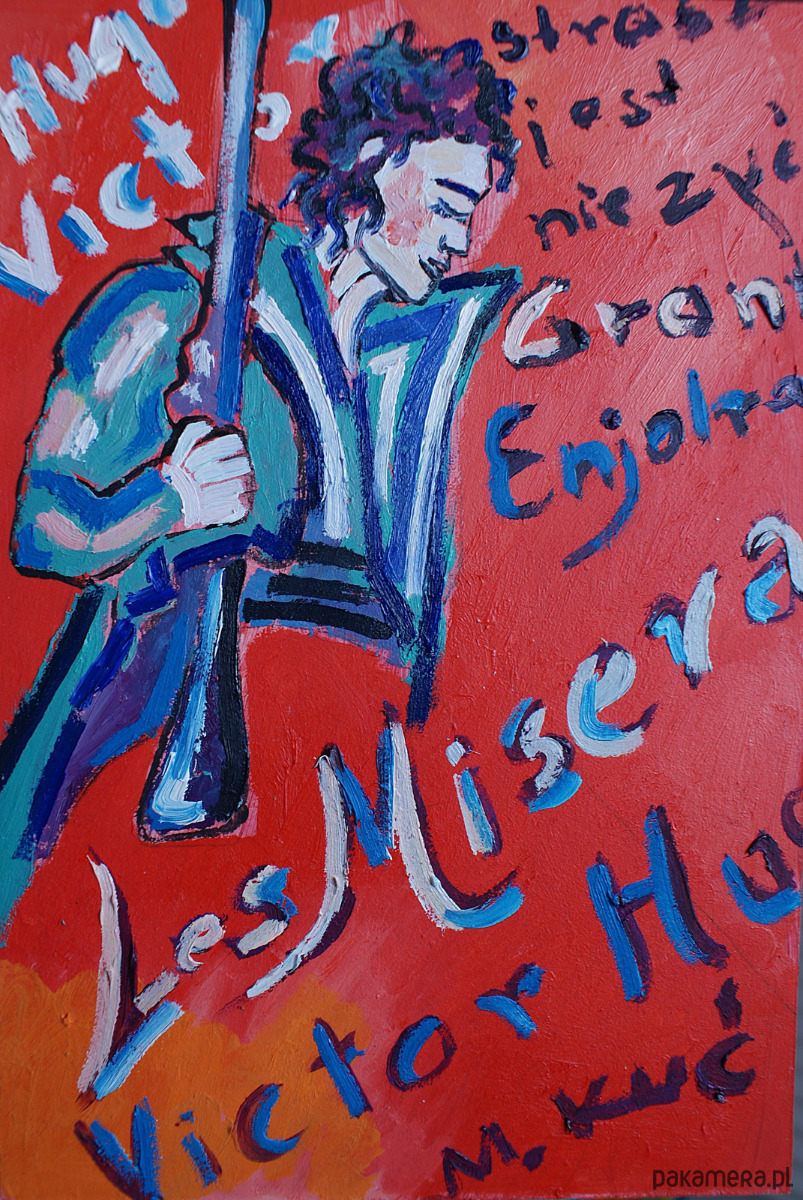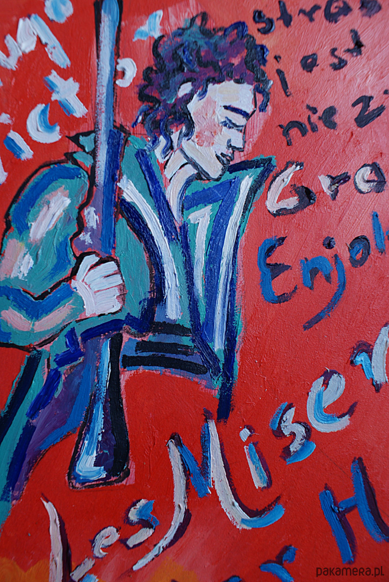 Na obrazie dominuje intensywna czerwień, która przyciąga wzrok jak magnes. Postać młodego mężczyzny, ubrana w niebieskie i zielonkawe odcienie, trzyma w ręku rewolwer, jakby przygotowywała się do walki. Emocje zawarte w jego twarzy są skomplikowane, łączą w sobie determinację i zadumę. Styl artystyczny, przypominający trochę postimpresjonizm, pełen energicznych pociągnięć pędzla, ożywia całą scenę. Literówki i słowa rozrzucone na powierzchni przypominają graffiti, dodając nieco surowości i chaosu. Całość jest dynamiczna, niemalże krzycząca energią. Patrząc na obraz, można poczuć ducha rewolucji i młodzieńczego buntu, skłaniającego do refleksji nad walką o ideały. Trochę jak w bajce, gdzie bohater walczy o swój świat. Klimat jest pełen napięcia, jakiś taki rebelious, niemalże namacalny. To dzieło unosi się na granicy między sztuką a manifestem, a w mojej głowie pojawia się myśl: Boże, jakie to żywe!