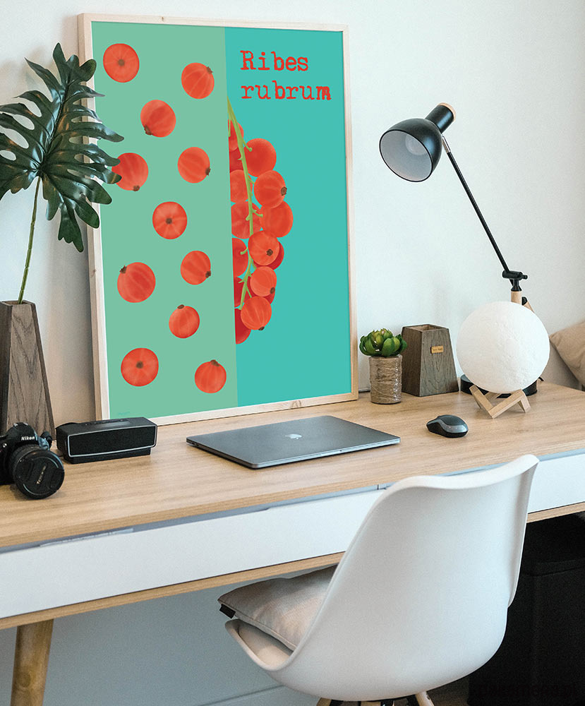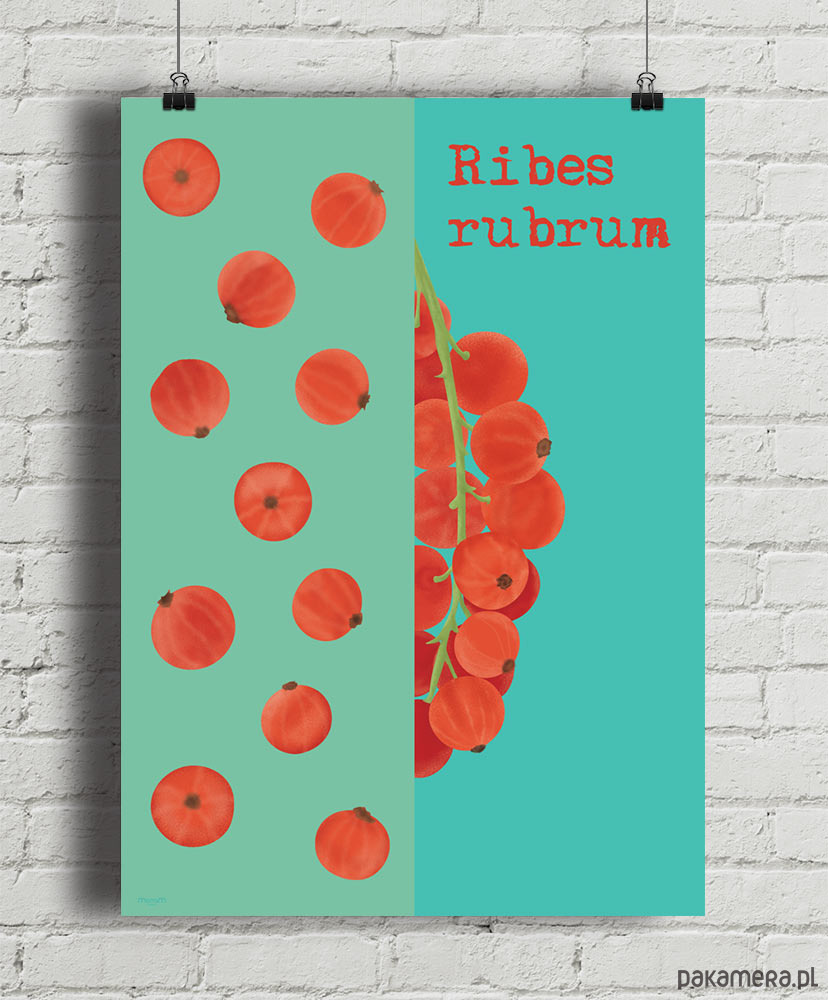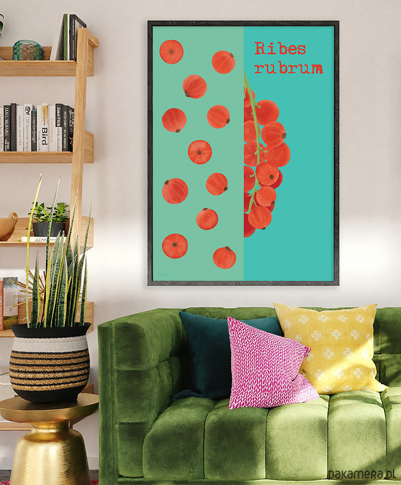 Plakat z autorską grafiką z serii Juicy fruits (Soczyste owoce). Przedstawia soczystą porzeczkę – jeden z najbardziej letnich owoców, którego smak nieodmiennie kojarzyć się będzie ze słonecznym popołudniem w ogrodzie. Oryginalna dekoracja do wymarzonej kuchni, salonu i jadalni.