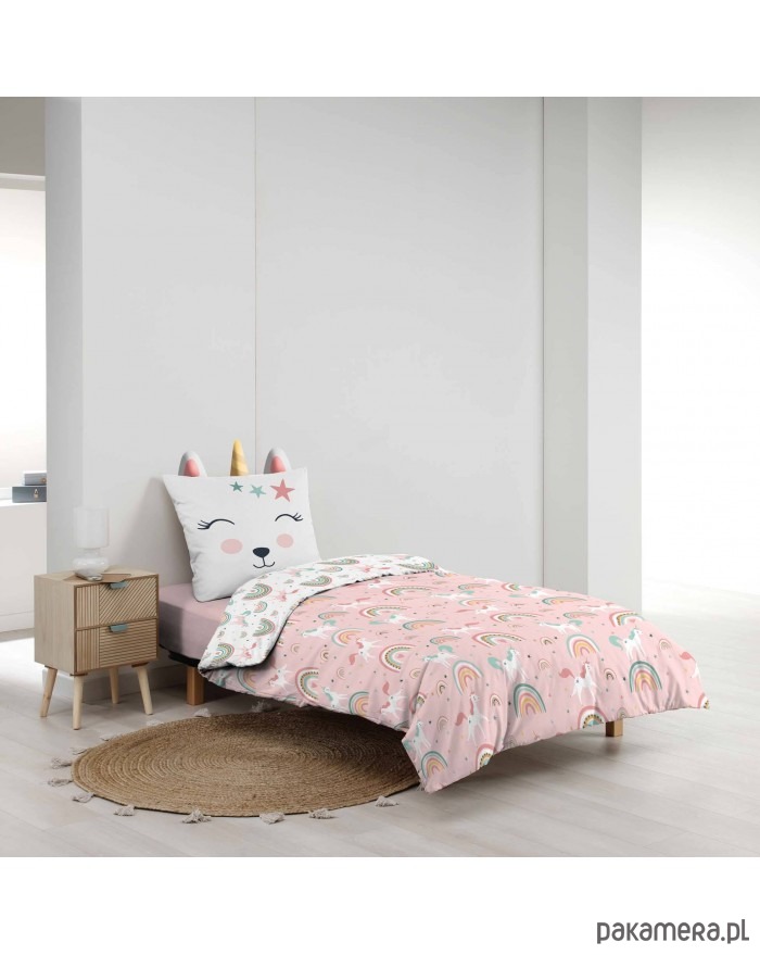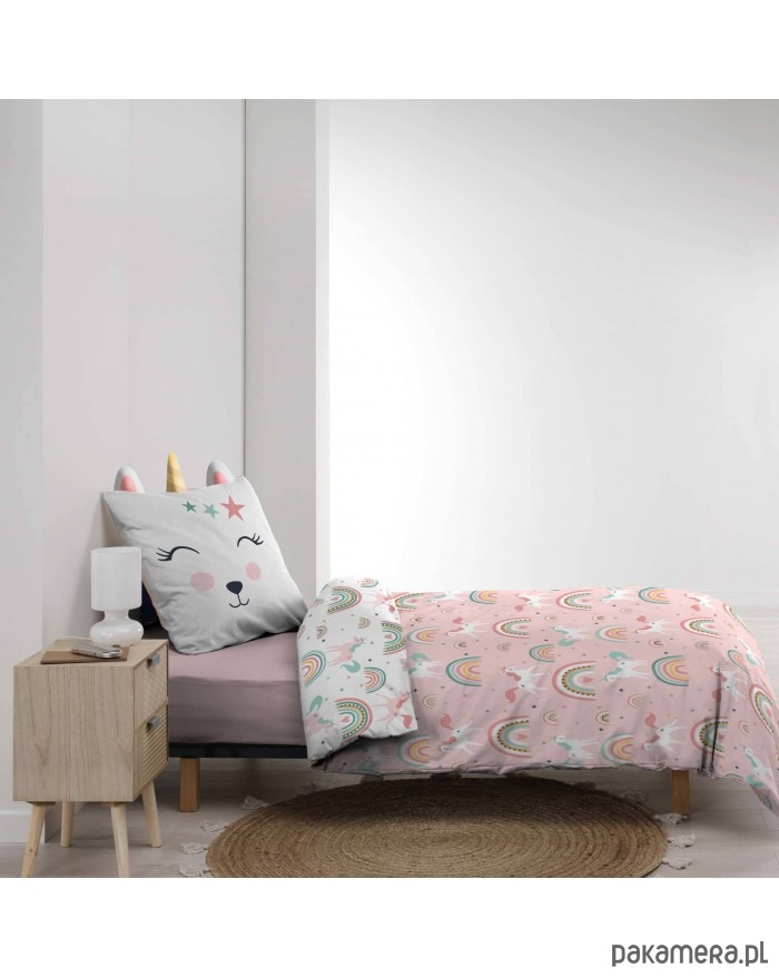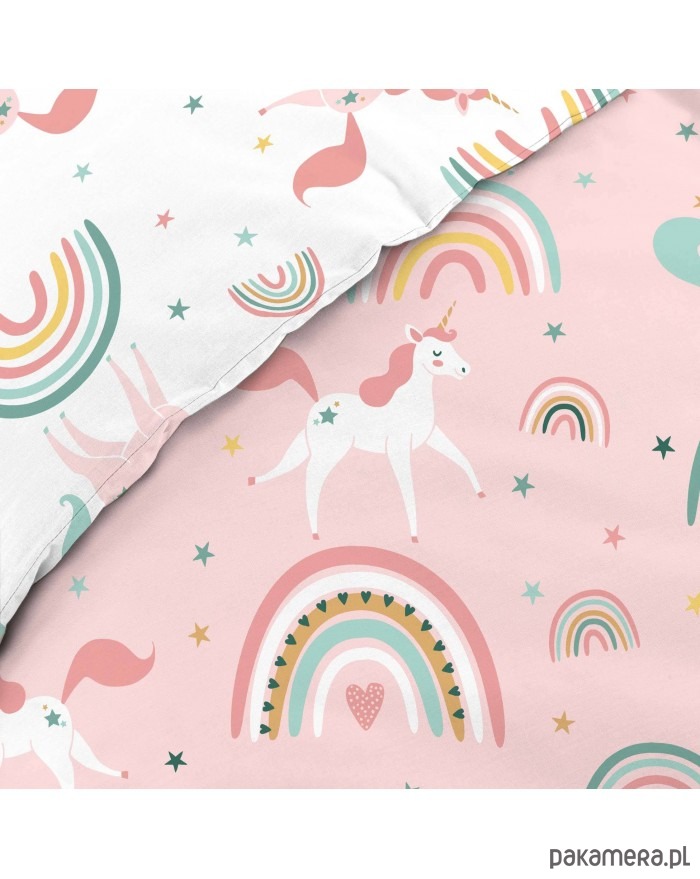 Komplet pościeli dziecięcej dwustronnej wykonany jest z wysokogatunkowej bawełny (100%), która jest delikatna w dotyku, a wykonana z niej pościel bezpieczna dla skóry, lekka oraz przewiewna. Komplet składa się z poszewki na poduszkę i poszwy na kołdrę, zapinanych na guziki. Pościel jest wielokolorowa z przewagą różowego, i ozdobiona motywami tęczy i jednorożców. Poduszka z jego podobizną ma wesołe uszka. Wspaniały dodatek do pokoju dziecięcego i młodzieżowego. Zaleca się prać w temperaturze 40°C i prasować max. 150°C.
