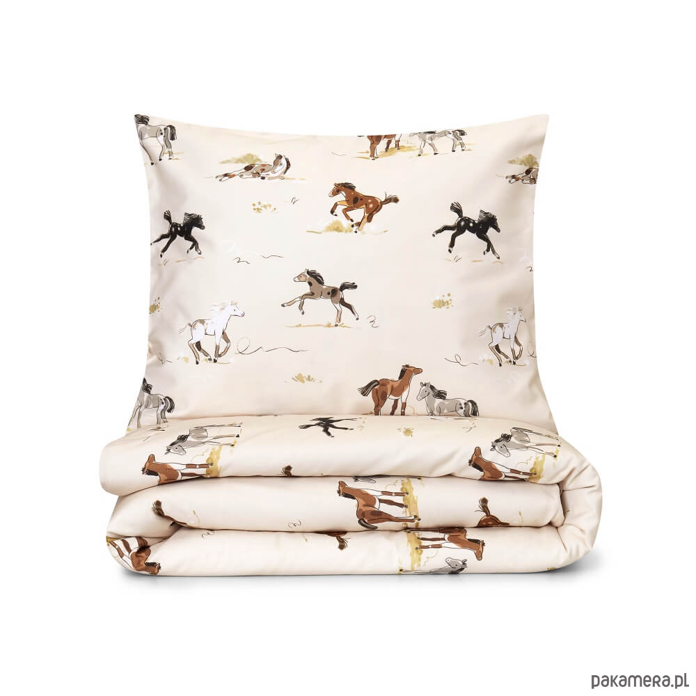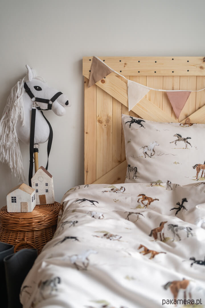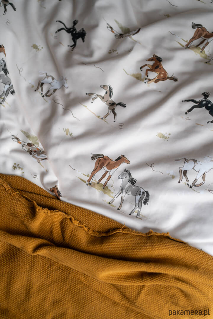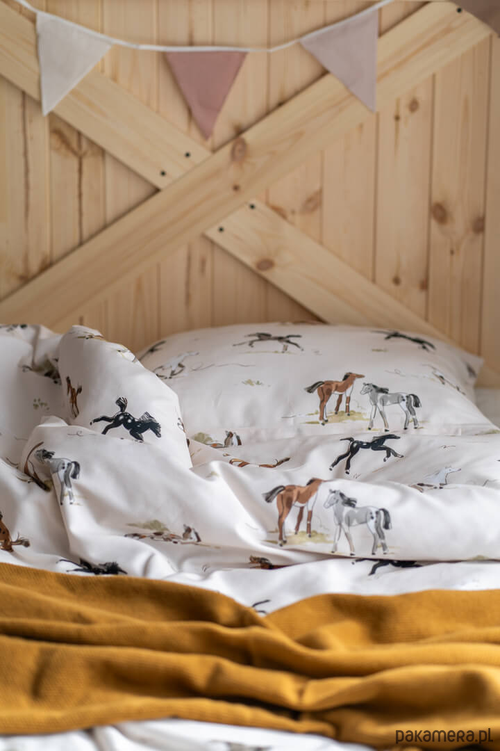 Wzór został przygotowany we współpracy z polskimi ilustratorami i przeniesiony na tkaninę za pomocą wodnych, bezzapachowych tuszy. Pościel dziecięca w konie jest całkowicie antyalergiczna i trwała – nadruk nie spiera się, nie farbuje i zachowuje intensywne kolory nawet po wielu praniach. Dwustronny wzór sprawia, że komplet prezentuje się pięknie niezależnie od ułożenia.