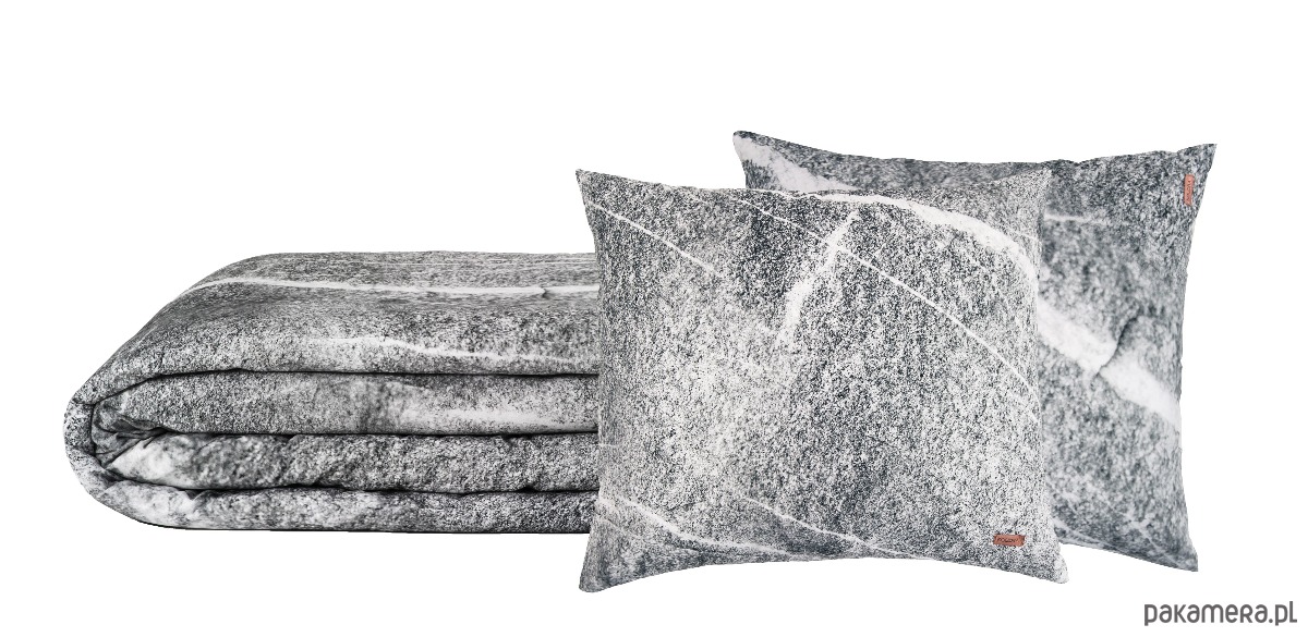 Zestaw pościeli z kolekcji Grey Granite z dwiema poduszkami. Wzór szarego granitu z jasnym użyłowaniem. Poszwa na kołdrę oraz poszewki na poduszki mają wszyty wysokiej jakości zamek błyskawiczny. Komplet jest zapakowany w ozdobny worek w taki sam wzór.