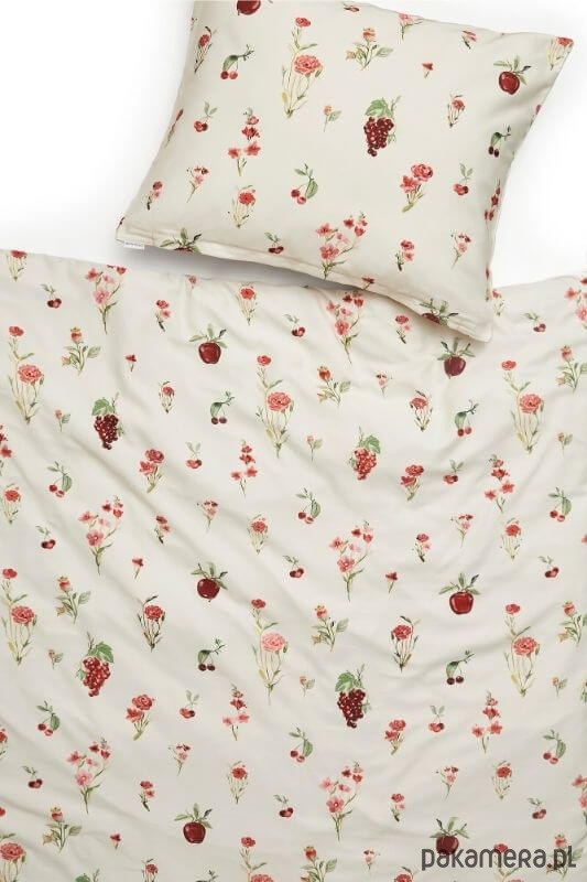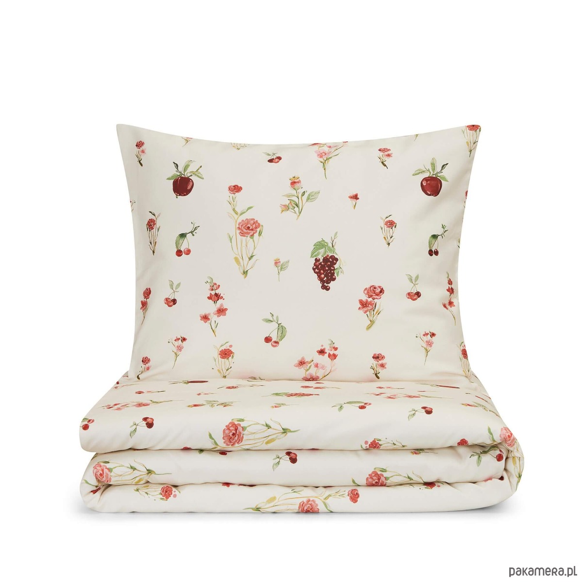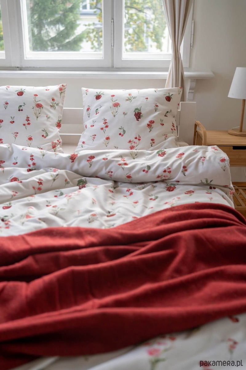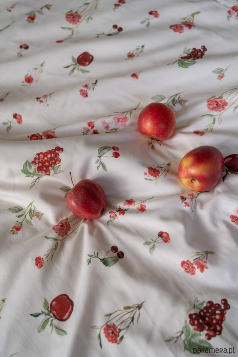 Przepiękne czerwone i burgundowe kwiaty kwiaty w towarzystwie soczystych, czerwonych owoców - to właśnie nasza pościel Dziki sad. Ten wzór będzie świetnie prezentował się w Twojej sypialni o każdej porze roku. Bogactwo czerwonych darów natury, nadrukowane na lekko kremowym tle, po obu stronach pościeli.