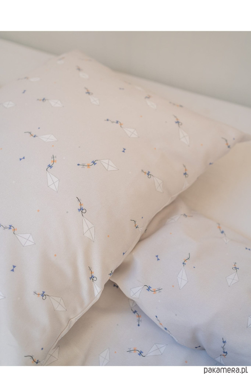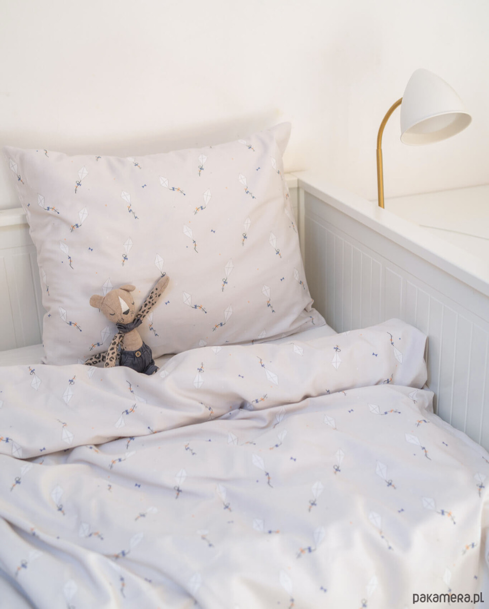 Puszczanie latawców to przede wszystkim ogrom radości dla dziecka. Możesz zachować tę radość i kolorowe wspomnienia, uzupełniając dziecięcy pokoik w pościel Latawce. Białe latawce, przeplatane kolorowymi akcentami, na szarym tle.