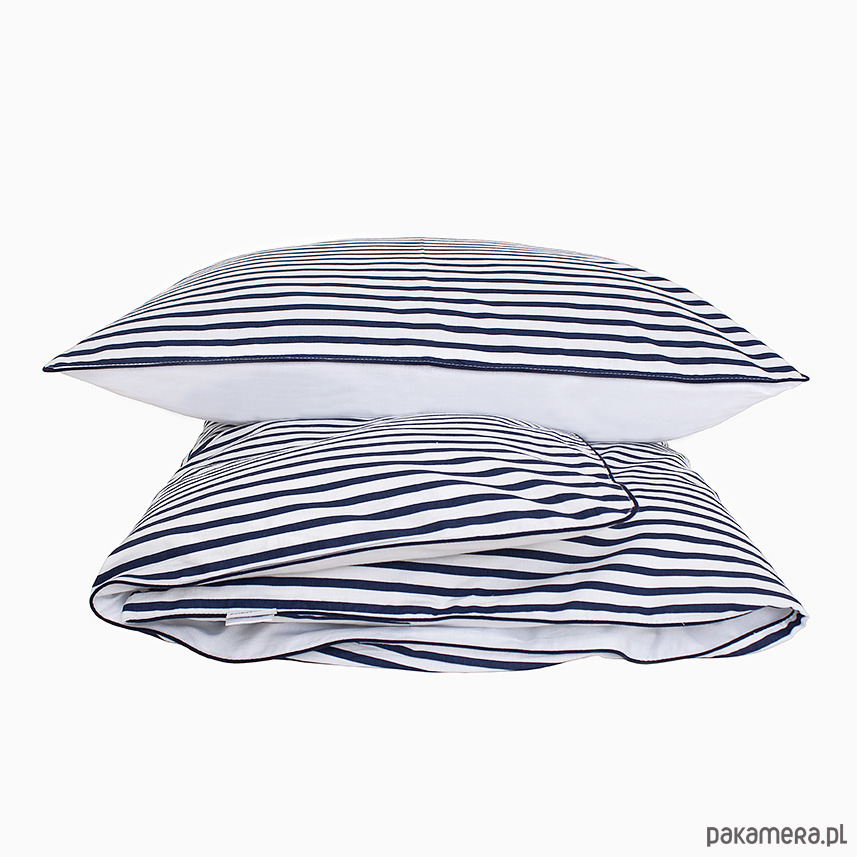 Dwustronna pościel z kolekcji "granatowo-białe paski" z granatową lamówką.
