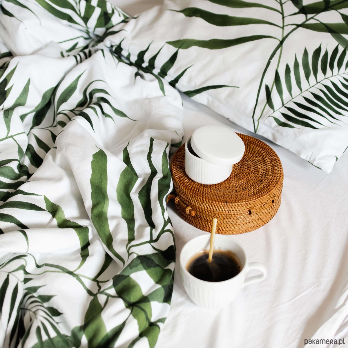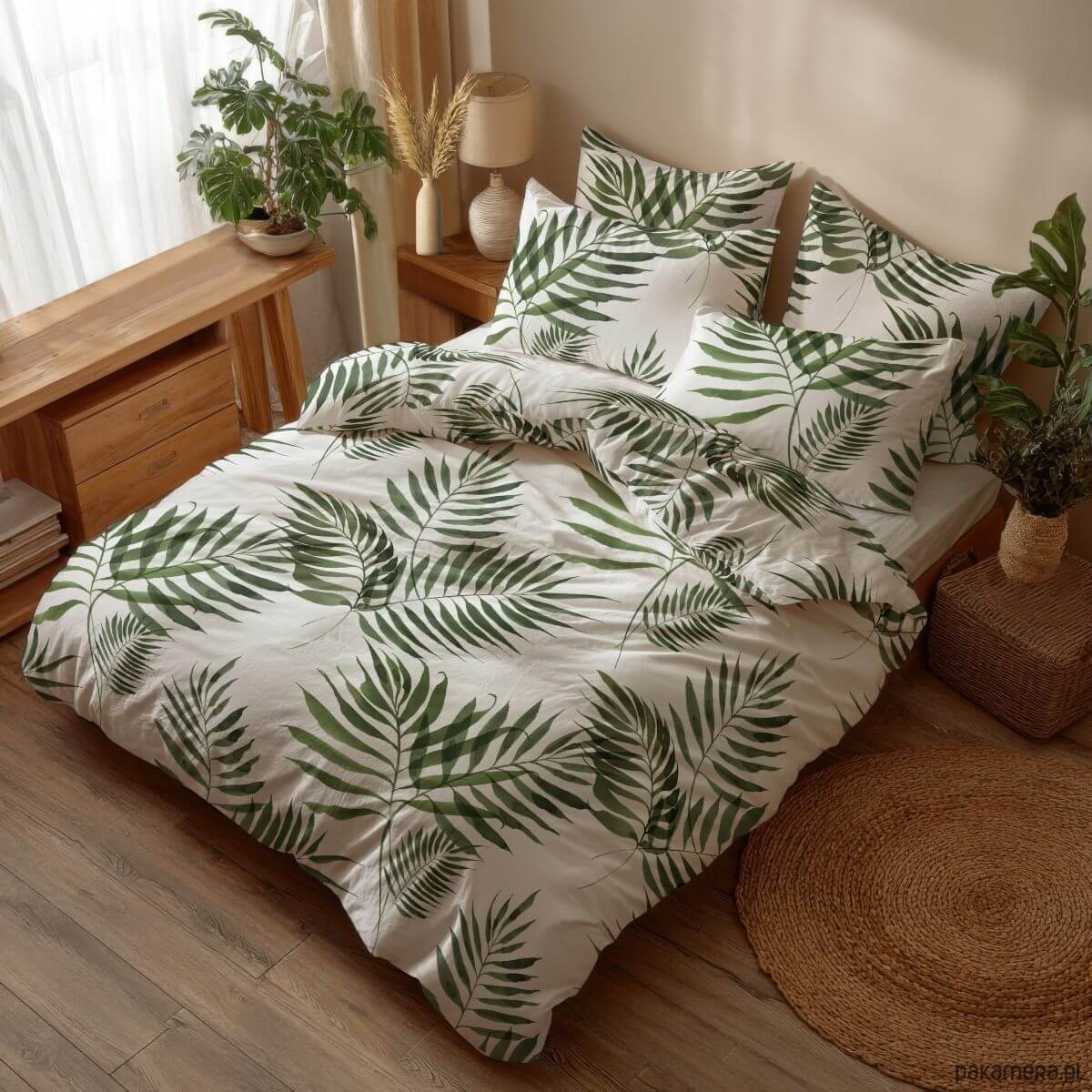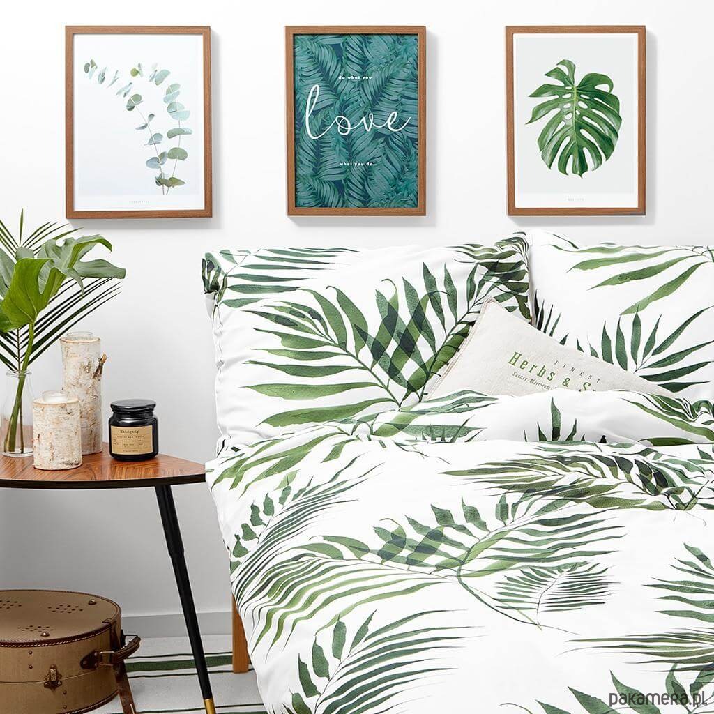 Komplet pościeli możesz uzupełnić o dodatkowe poszewki ze wzorem palmy lub gładkie prześcieradło z satyny bawełnianej.