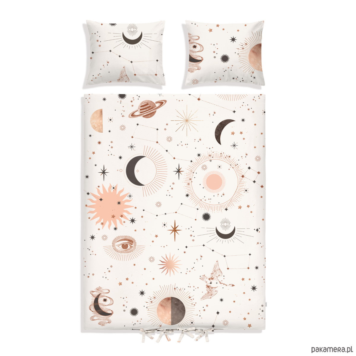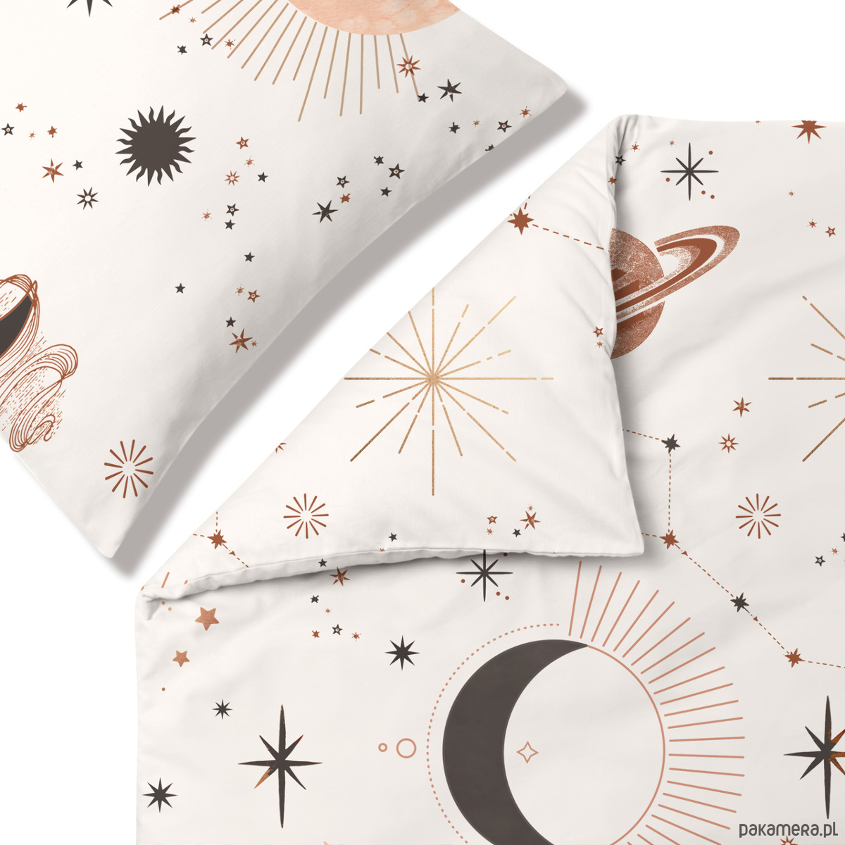 Asteria to dwustronna pościel z galaktycznym motywem. Na pościeli Asteria znajdziemy nie tylko słońce, gwiazdy czy księżyc, ale również planety oraz mały wóz. Wzór Asteria to propozycja przedstawiająca galaktykę w nowoczesnym stylu, utrzymana w ciepłych odcieniach beżu i brązu, dzięki czemu tworzy przytulną atmosferę w sypialnianym wnętrzu. Zagości w sypialniach u tych, którzy uwielbiają długimi godzinami wpatrywać się w gwiezdne niebo.
