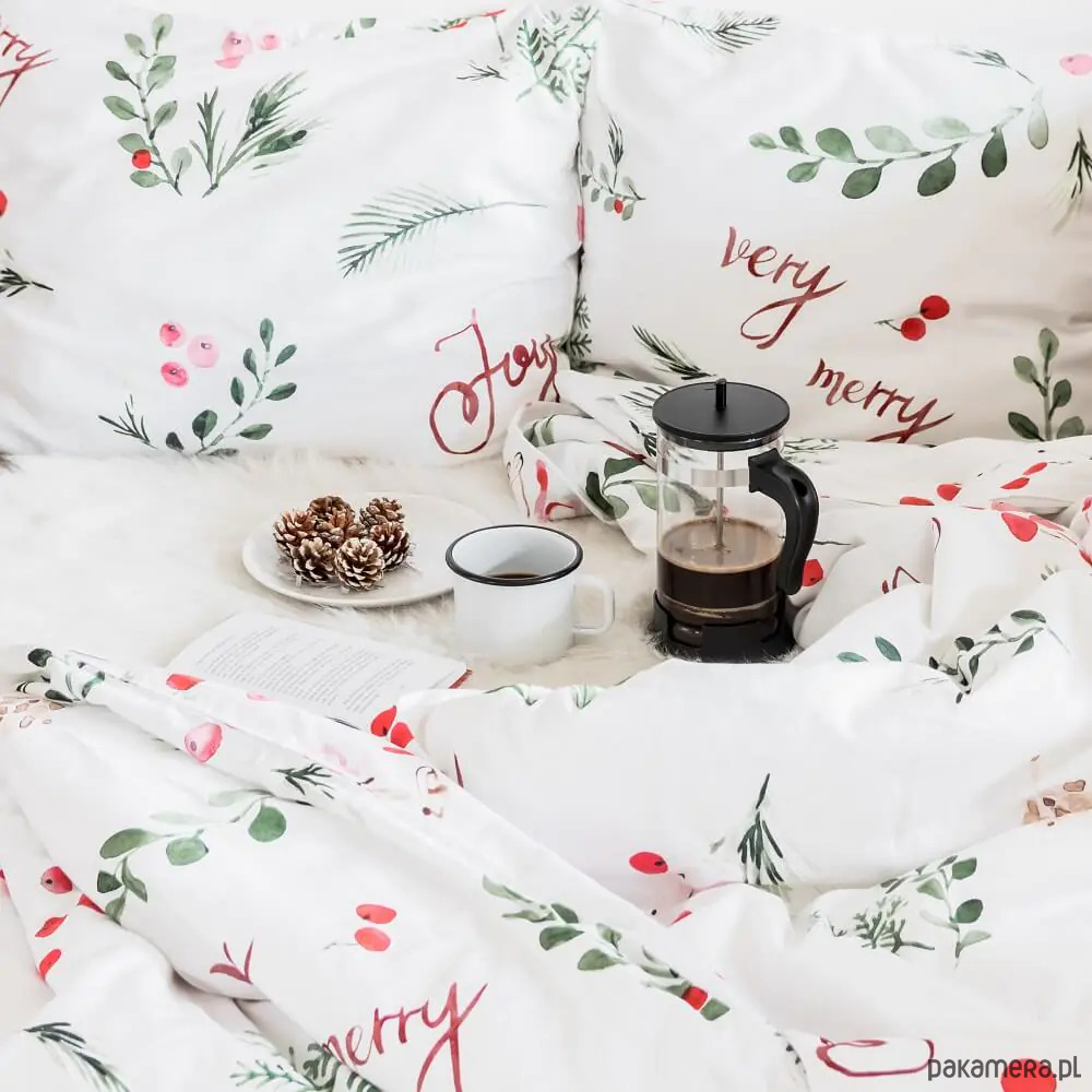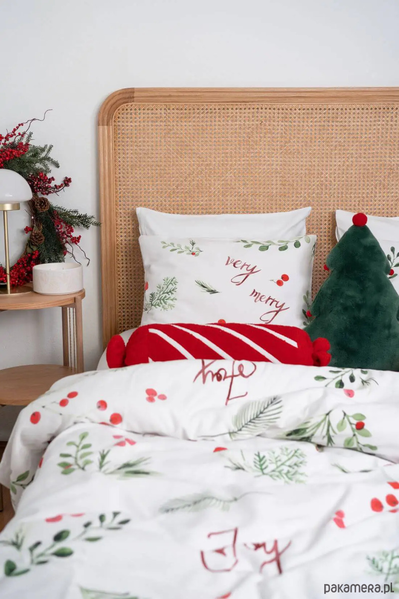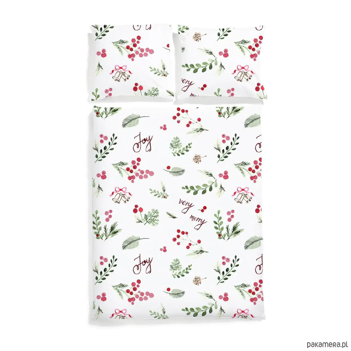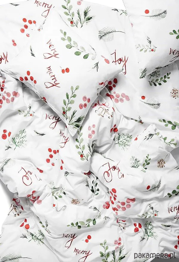 Pościel świąteczna w ostrokrzew Very Merry to wyjątkowa propozycja, która wprowadzi do Twojej sypialni magię świątecznych dni. Subtelny wzór z zielonymi listkami, czerwonymi owocami i drobnymi motywami świątecznymi – dzwoneczkami, prezentami oraz napisami Joy i Very Merry – tworzy ciepły, radosny klimat typowy dla grudniowych wieczorów.