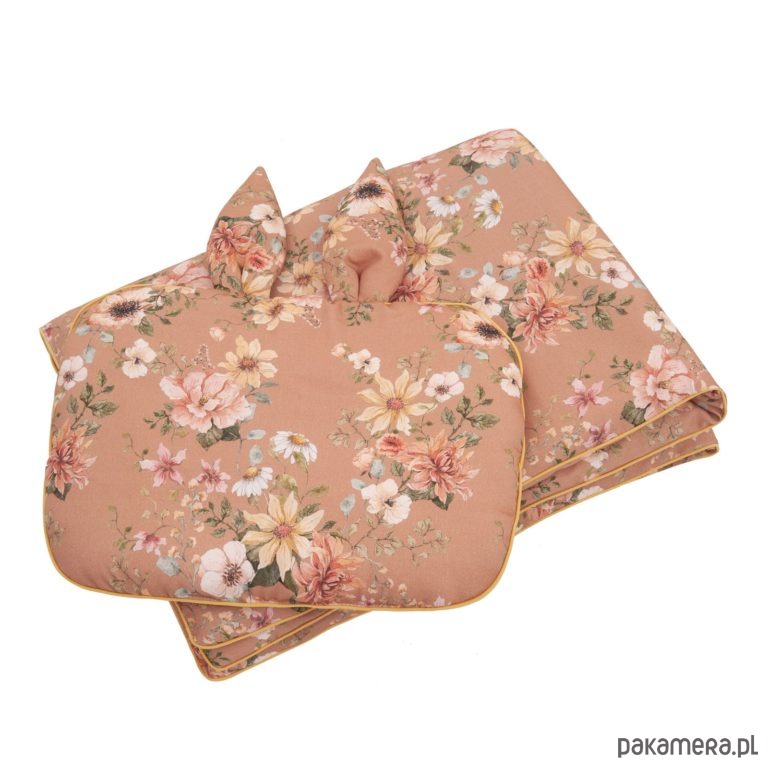 Opakowanie zawiera:kołdrę wzór vintage bloom o wymiarach 75 cm x 100 cm musztardowa wypustka, na stałe zszytą z wypełnieniem