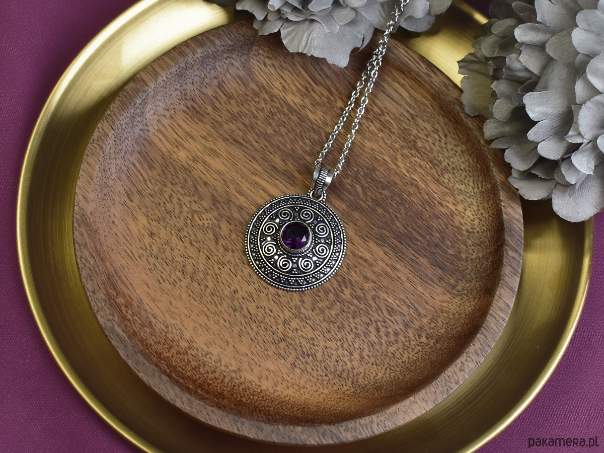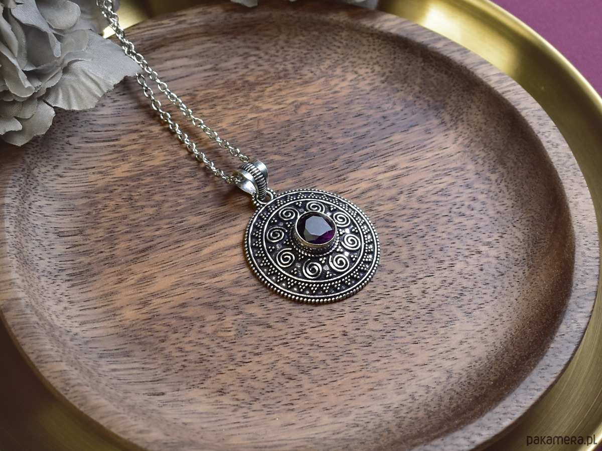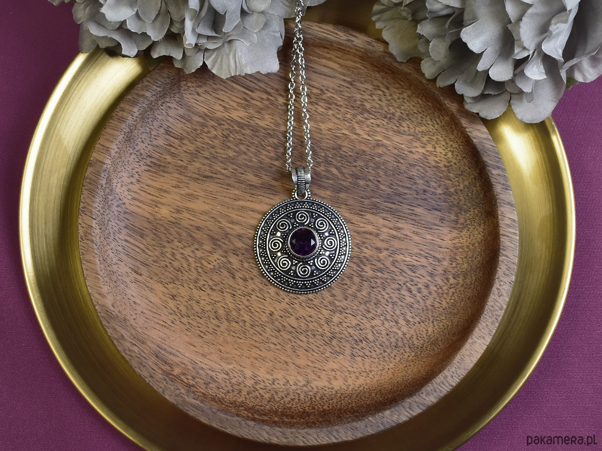 Wisiorek jest ręcznie wykonany z miedzi, pokryty srebrem, co nadaje mu elegancki wygląd. Jego okrągły kształt oraz wzory nawiązują do tradycyjnej etnicznej bizuterii, co dodaje mu unikalnego charakteru. Centralnym elementem jest ametyst, kamień o głębokim fioletowym kolorze, znany z właściwości kojących i oczyszczających. Ametyst jest ceniony także ze względu na swoje właściwości ochronne i zdolność wspierania spokoju umysłu. Wisiorek ten jest doskonałym wyborem dla osób ceniących tradycję i naturalne materiały.