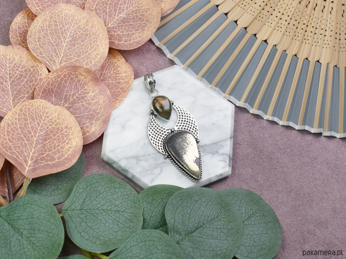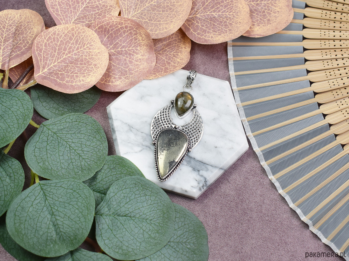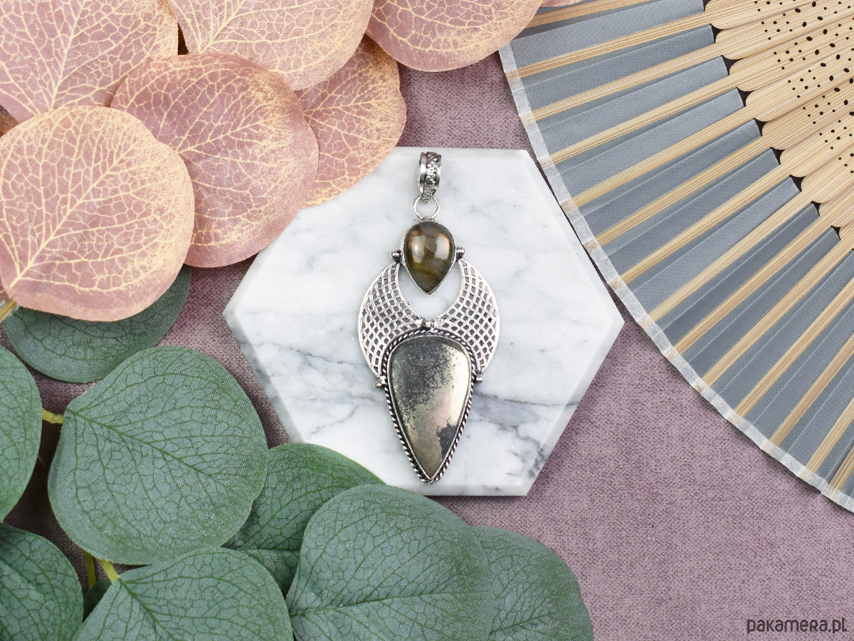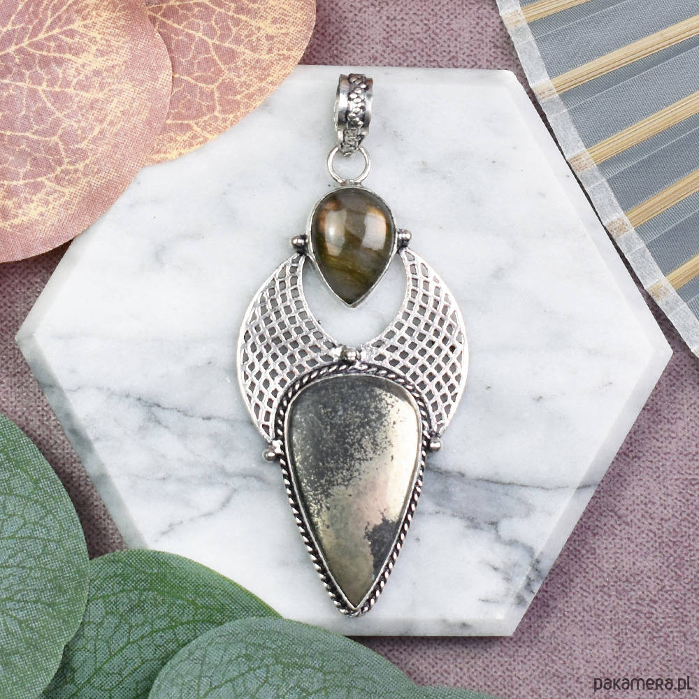 Posrebrzany miedziany ozdobny wisiorek z pirytem i labradorytem #590