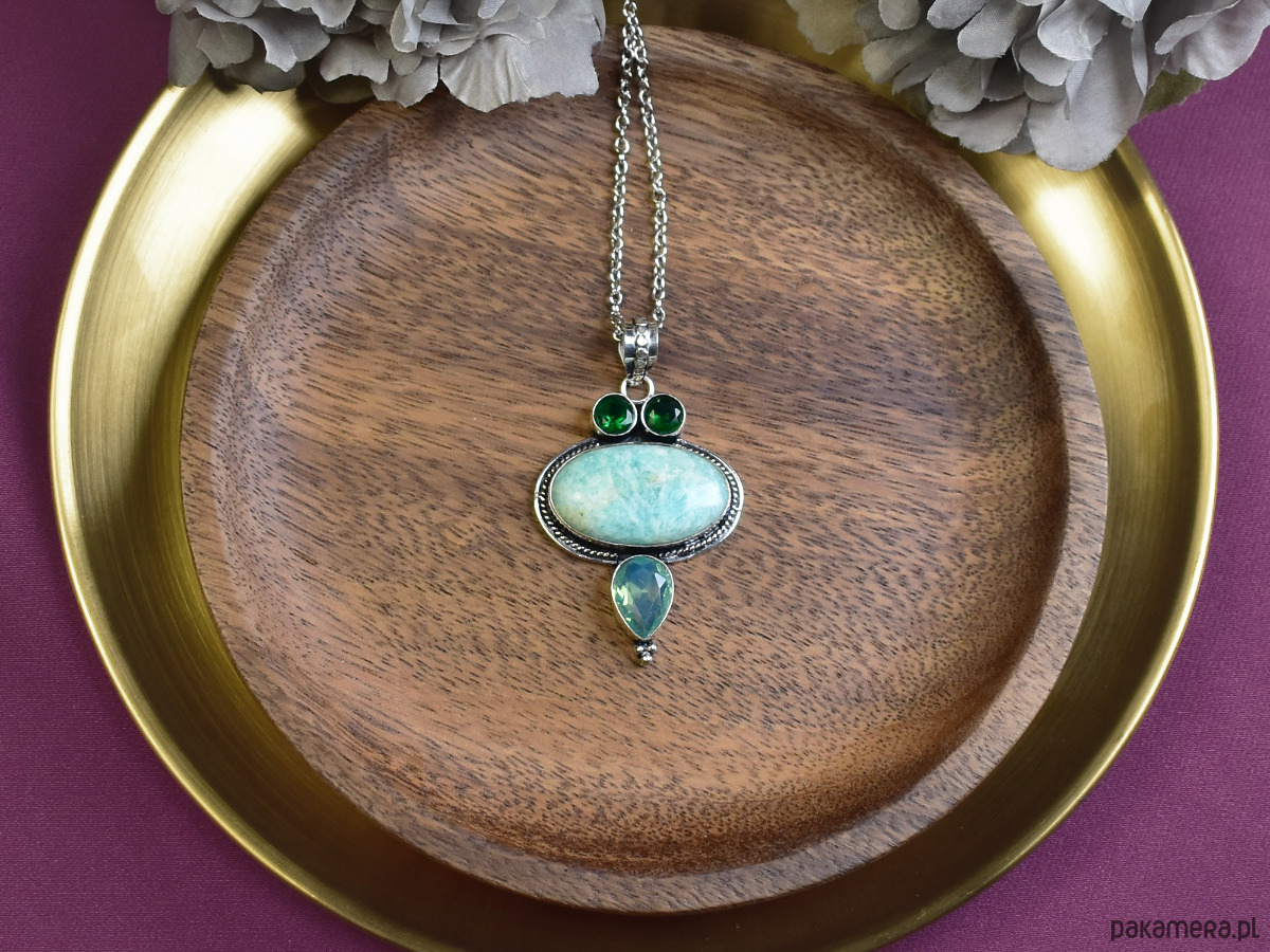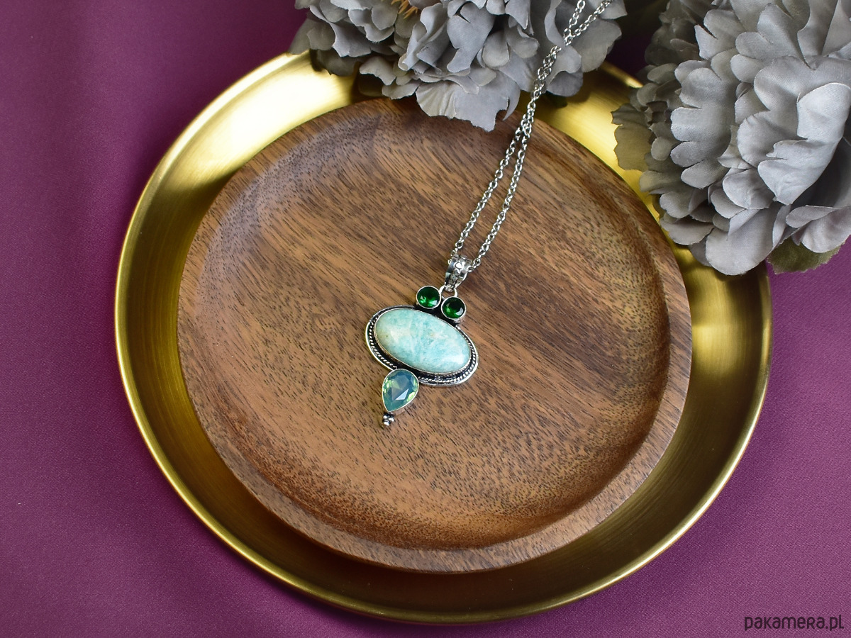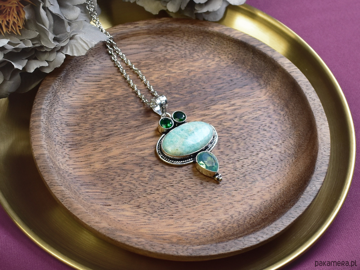Posrebrzany ozdobny wisiorek z amazonitem, prehnitem i zielonym kwarcem #641