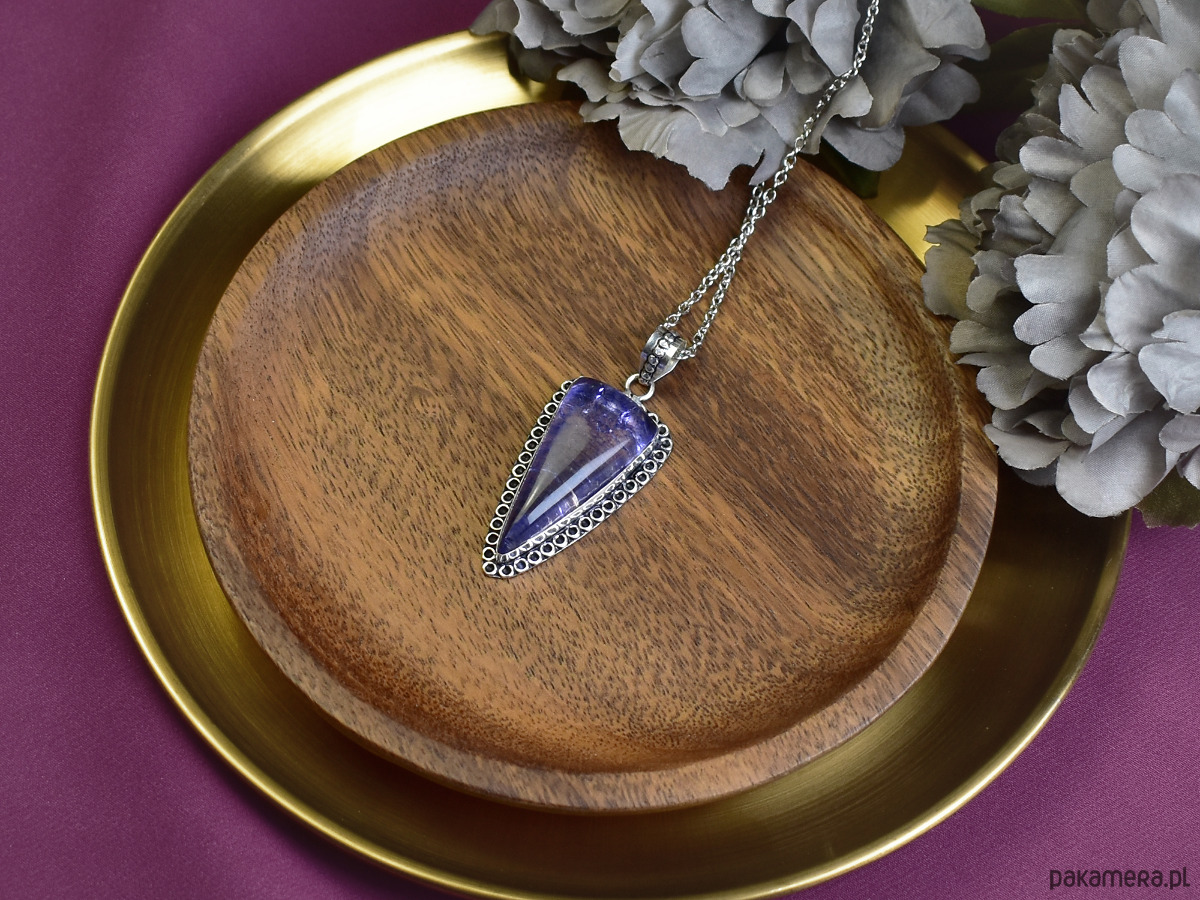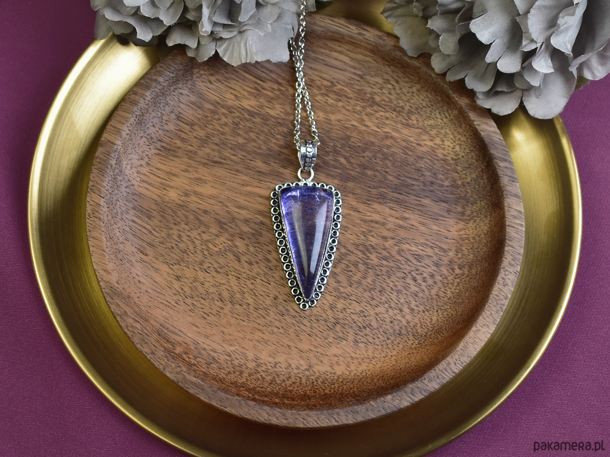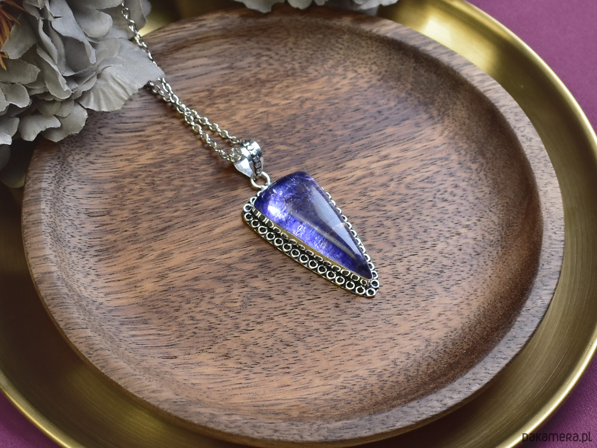 Wisiorek wykonany ręcznie z miedzi, pokryty srebrem. Głównym elementem jest kamień typu Snake Skin Quartz. Kamienie te charakteryzują się unikalnym wzorem przypominającym skórę węża. Każdy wisiorek jest niepowtarzalny ze względu na naturalne różnice w strukturze kamienia. Idealny jako wyjątkowy dodatek do codziennych stylizacji.
