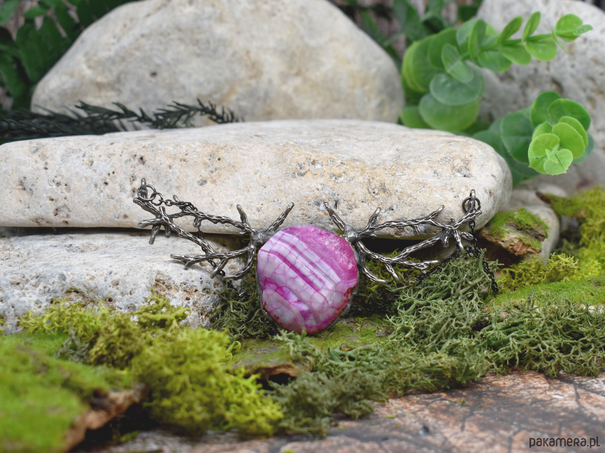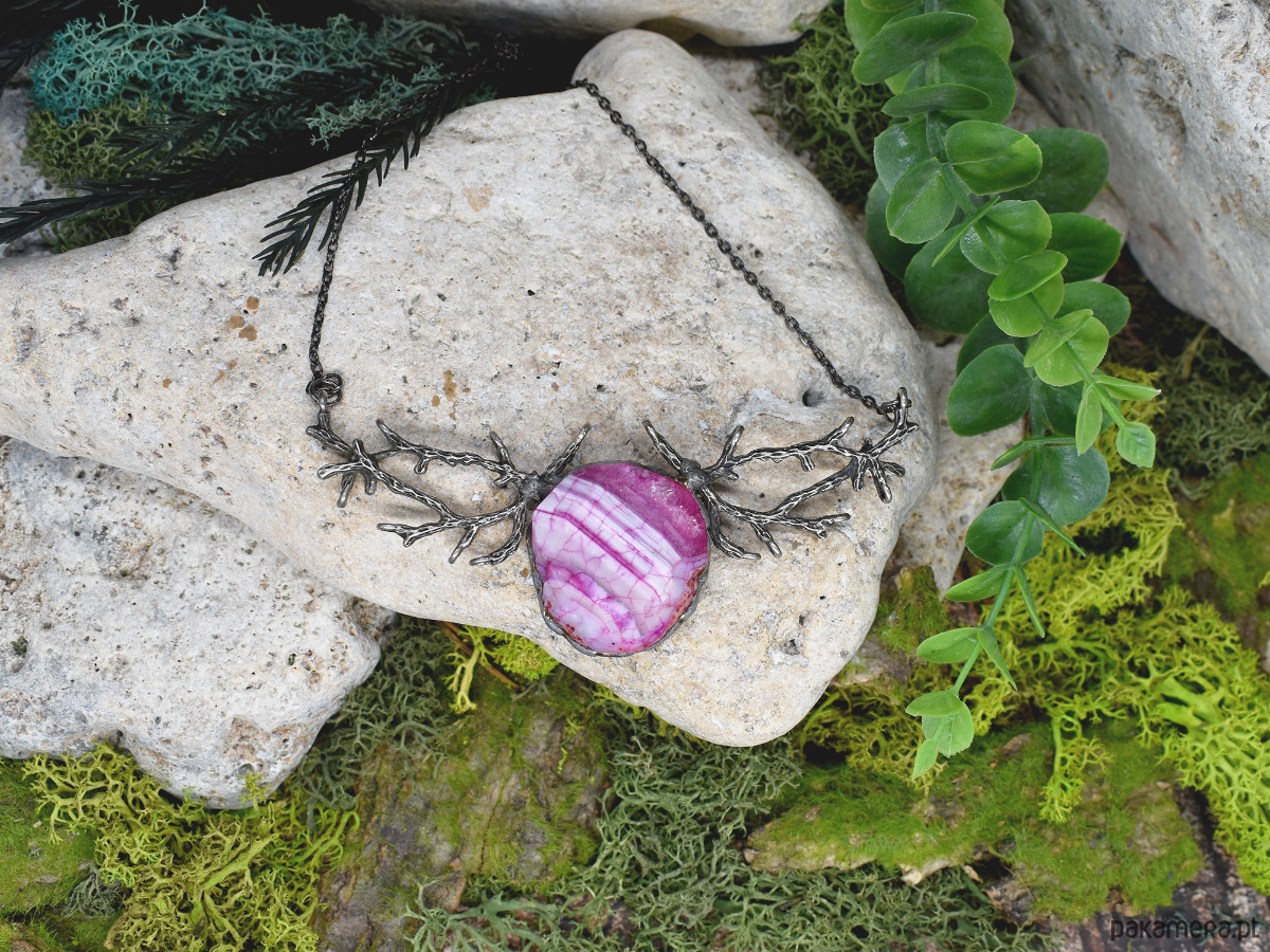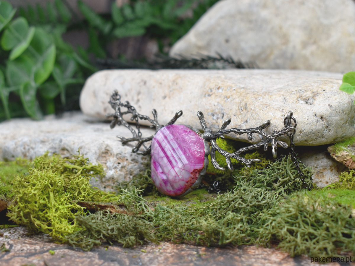 Ręcznie wykonany wisior z różowym agatem z widoczną druzą. Oprawa wykonana techniką Tiffany z miedzi i cyny, patynowana.