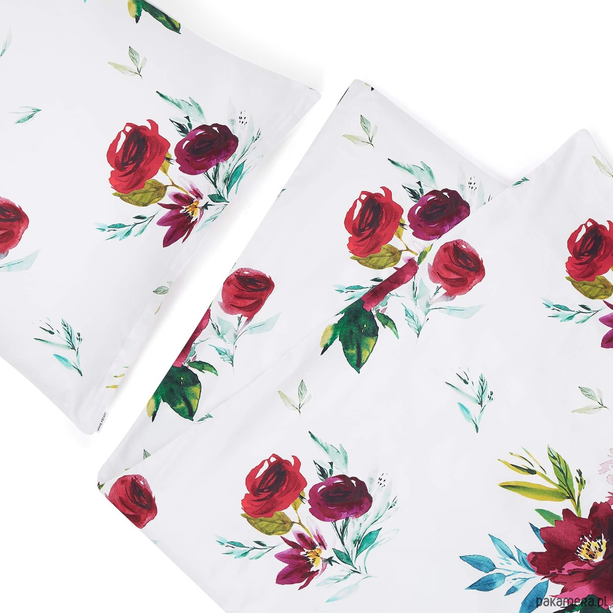 Dobierz poszewkę w czerwone, eleganckie bukiety do swojego kompletu pościeli. Ciesz się pięknym, spójnym i estetycznym wyglądem swojego łóżka. Wzór nadrukowany na obu stornach poszewki. Wykonana została z miękkiej i przyjemnej bawełny o satynowym splocie.