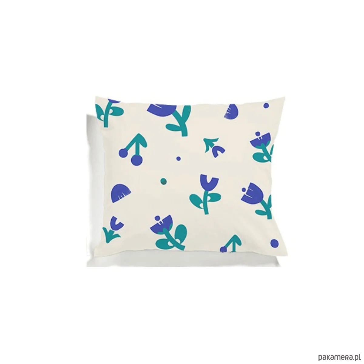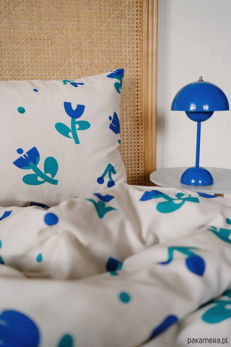 Poszewka Graficzne Tulipany to nowoczesny akcent do sypialni lub salonu. Geometryczne niebieskie tulipany na jasnym tle tworzą świeży, minimalistyczny wzór, który ożywia wnętrze i dodaje mu lekkości. Świetnie wygląda zarówno solo, jak i w komplecie z pościelą z tej samej kolekcji.