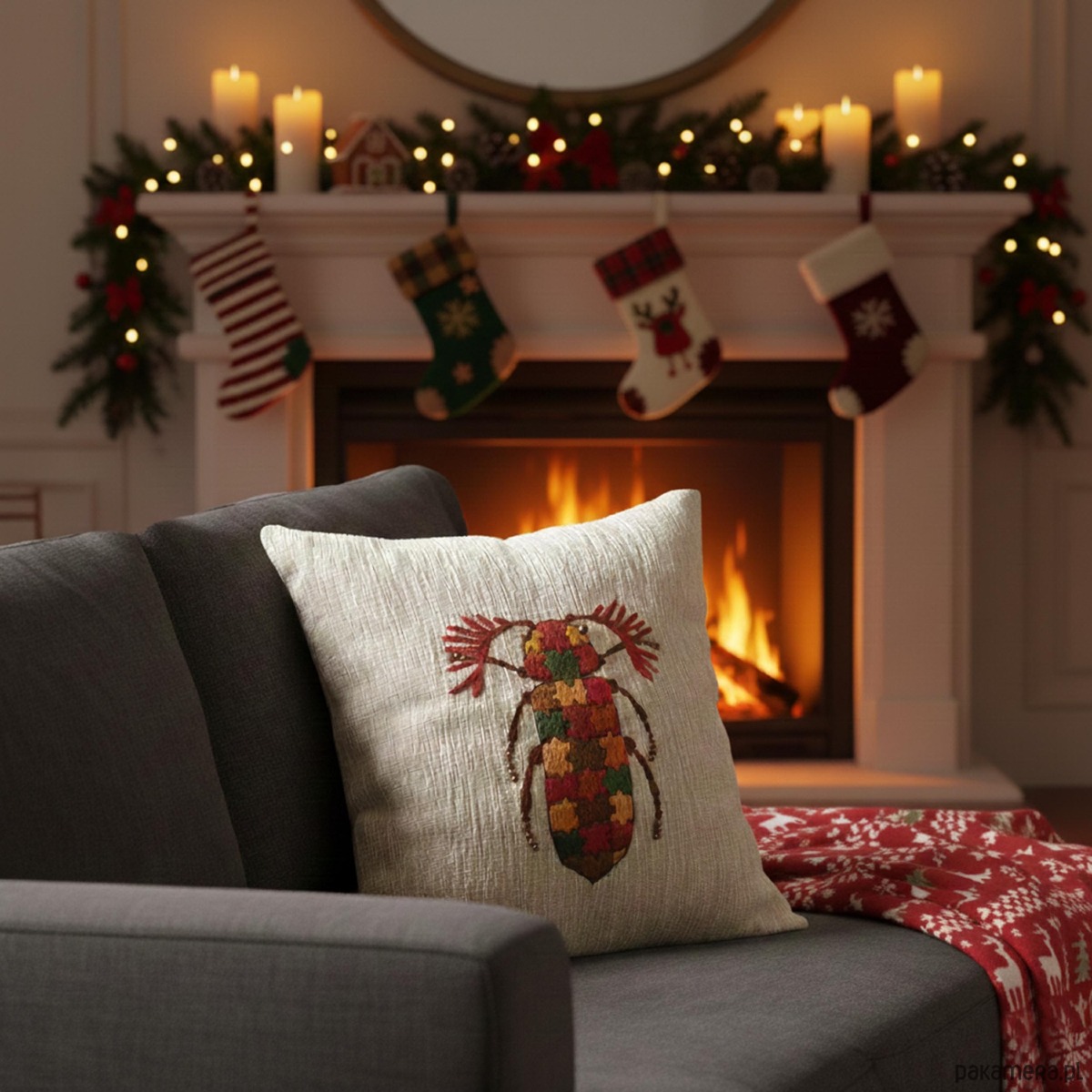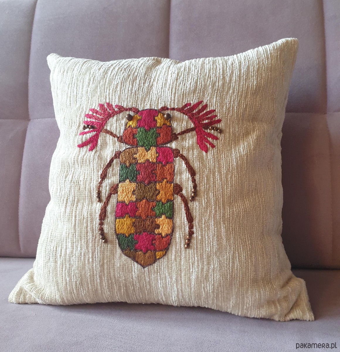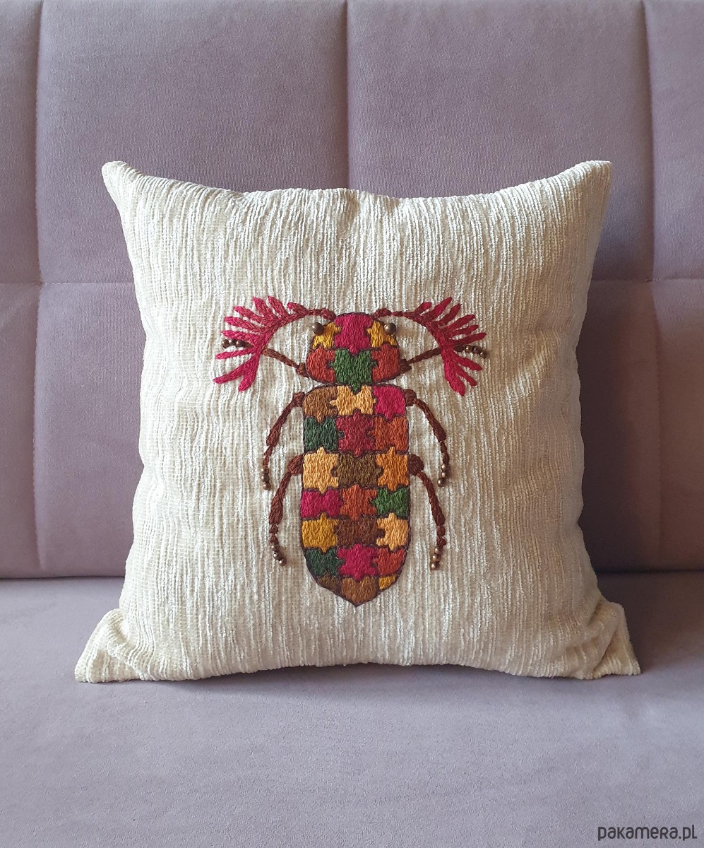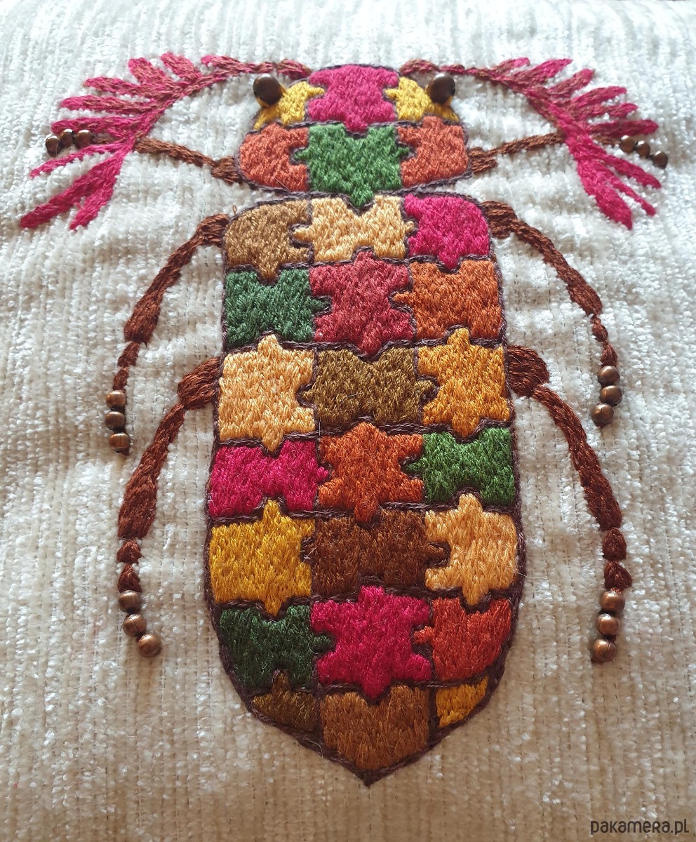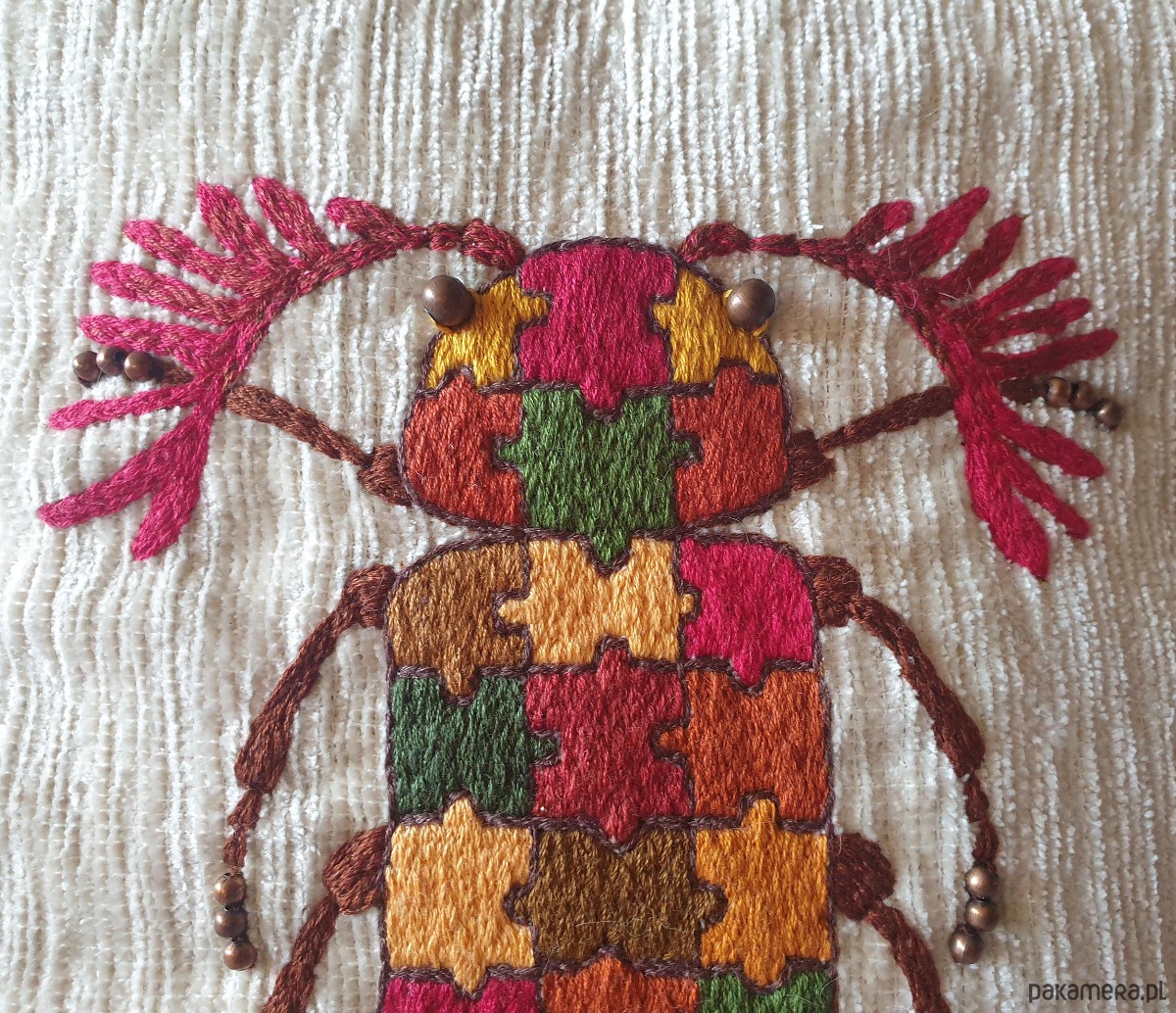 Wyhaftowany chrząszcz, złożony z jesiennych „puzzli” w odcieniach miedzi, ochry, burgundu i brązu, wygląda jak stworzenie, które powstało prosto z plątaniny spadających liści. Może przysiadł tu tylko na chwilę, a może zostanie na dłużej.
