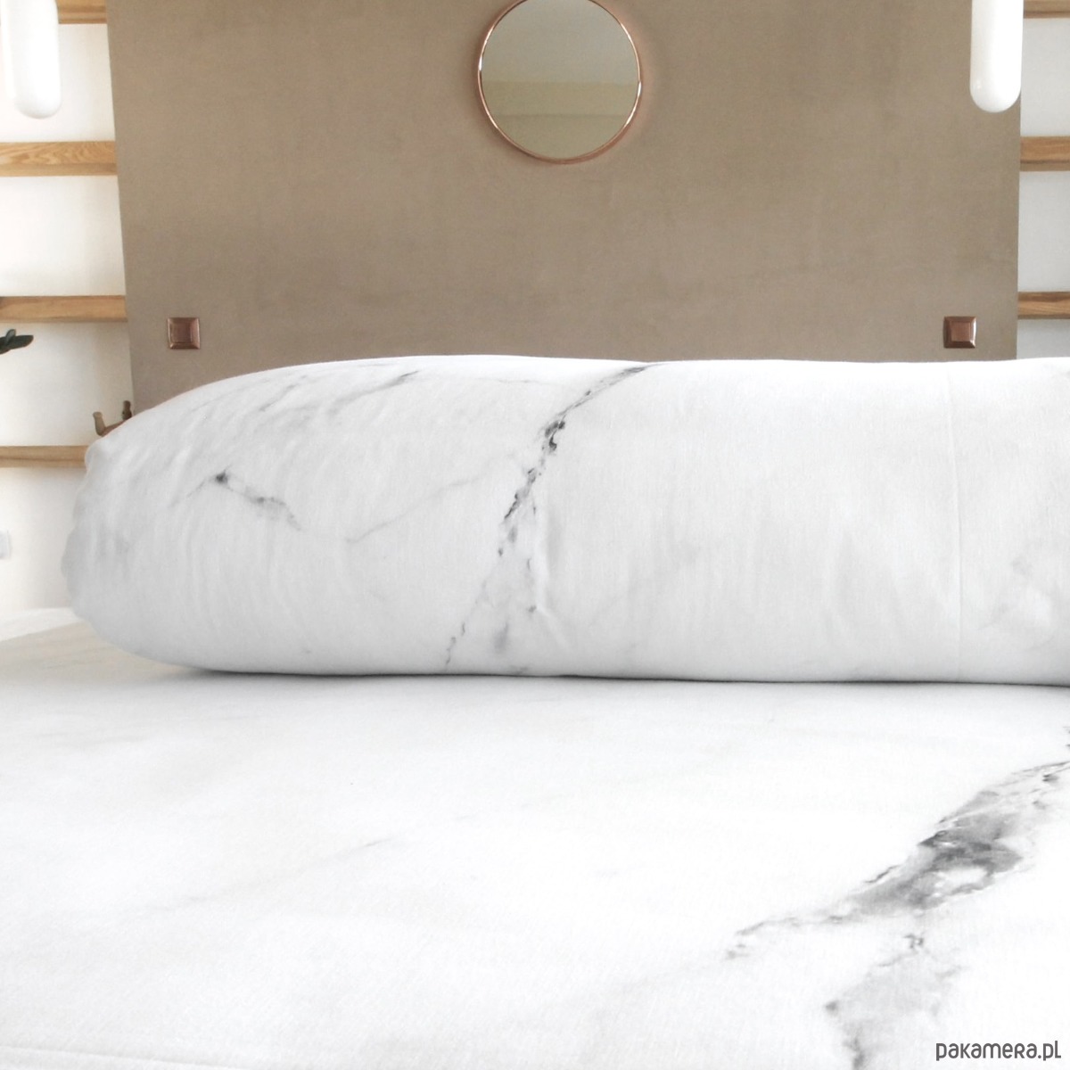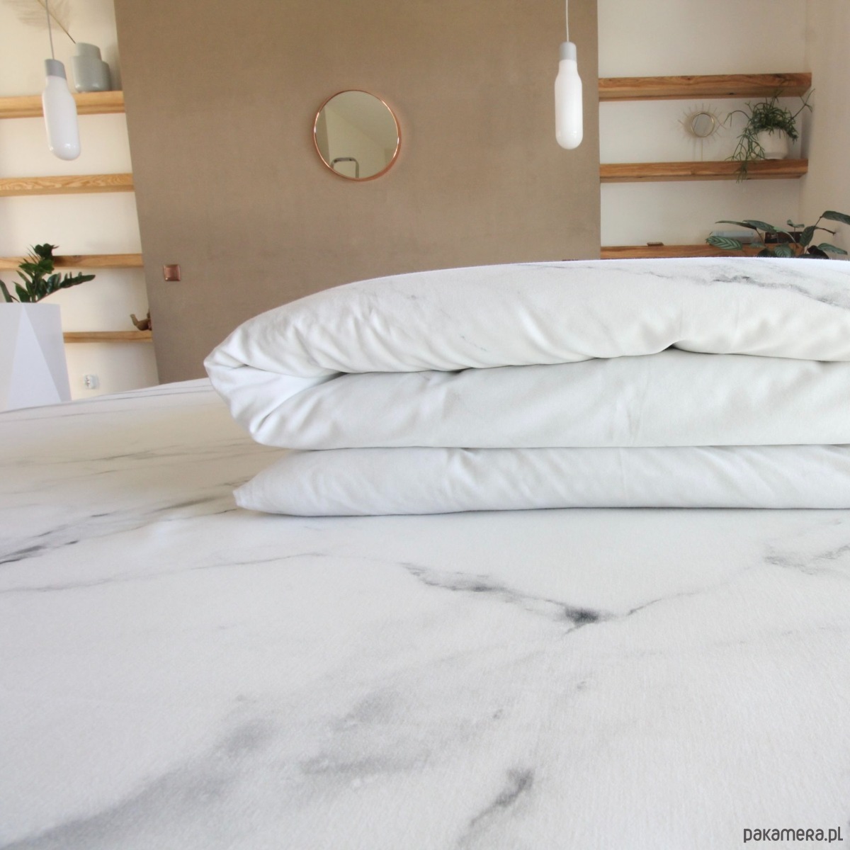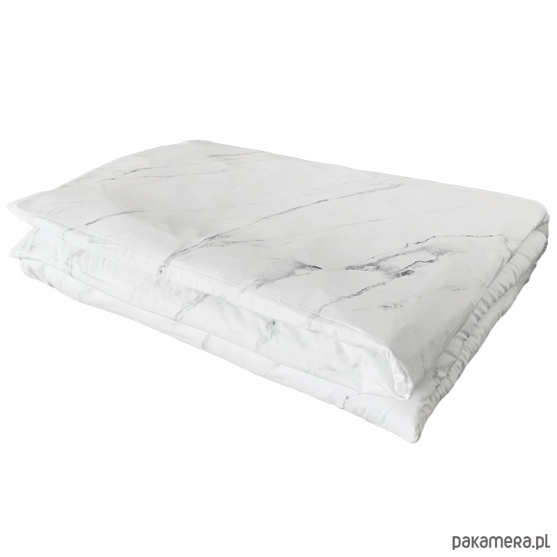 Poszwa na kołdrę z kolekcji WHITE MARBLE. Wzór naturalnego białego marmuru z szarymi użyłowaniami. Poszwa ma wszyty wysokiej jakości zamek błyskawiczny oraz jest zapakowana w ozdobny worek w taki sam wzór.