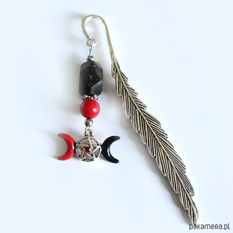 Oryginalna zakładka do książki z kostką surowego turmalinu, koralem i symbolem Potrójnej Bogini. Ręcznie malowana.