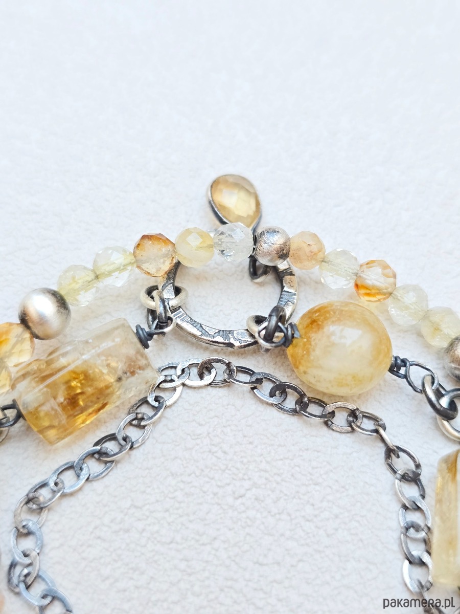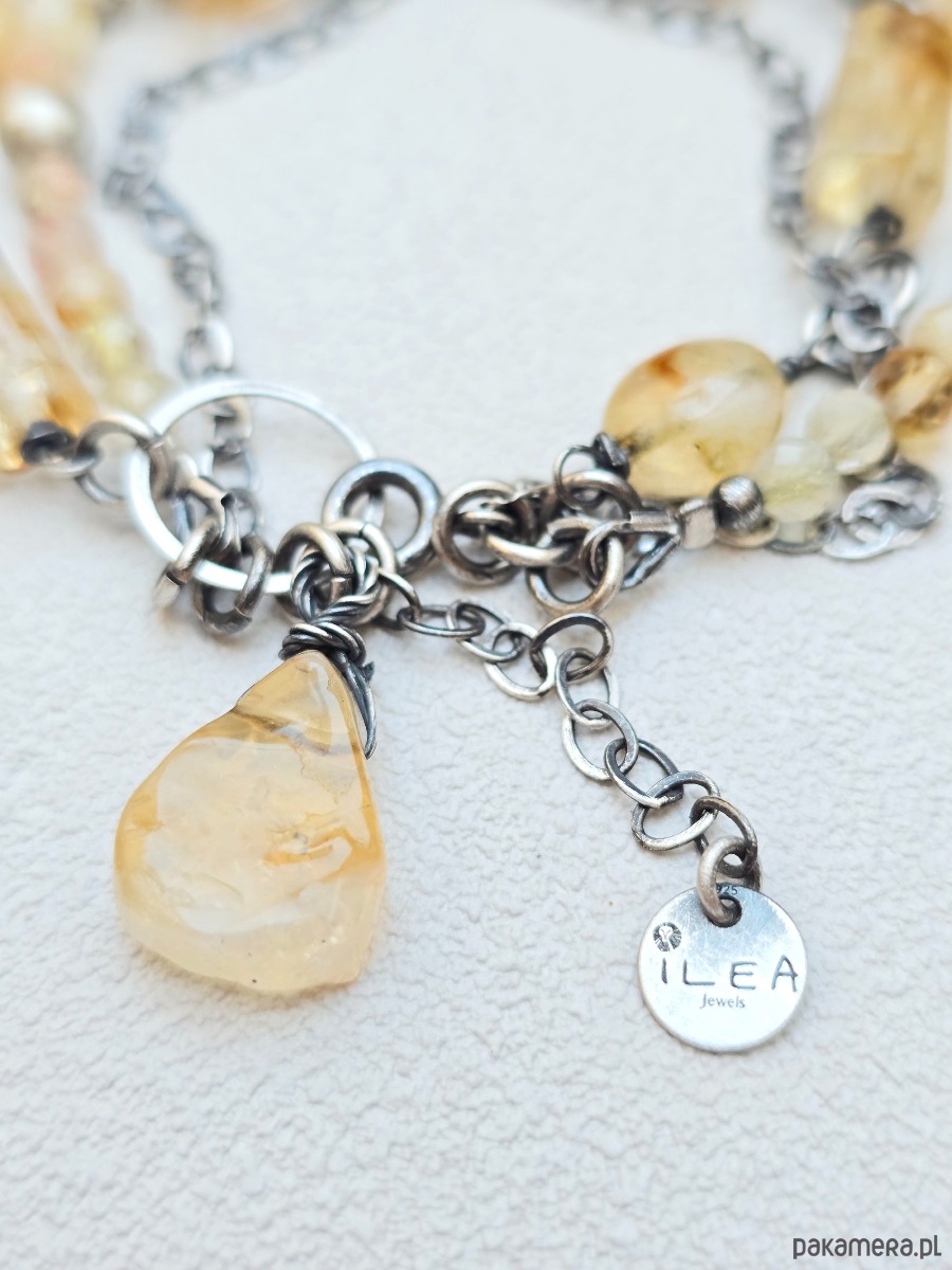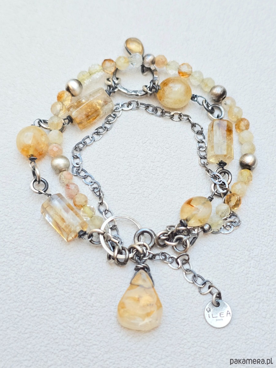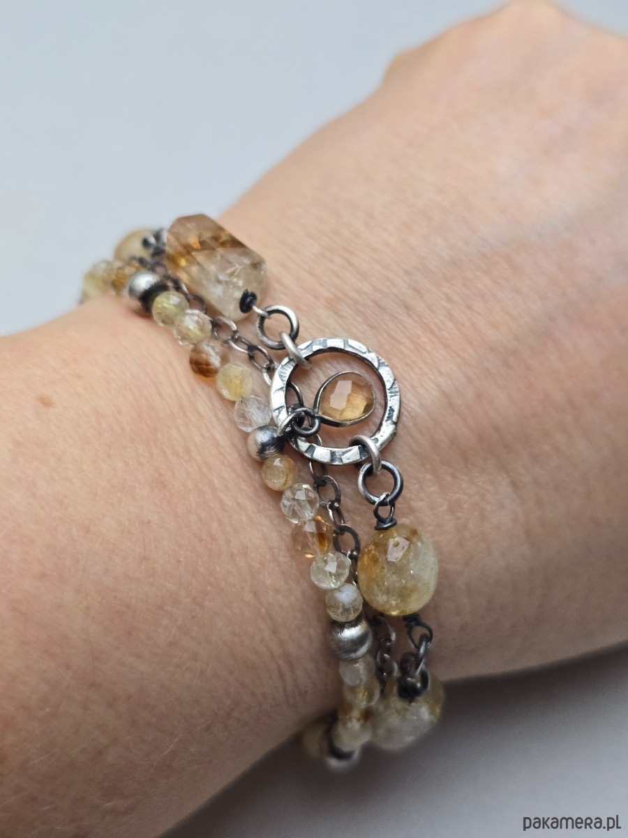 Potrójna bransoletka wykonana z kamieni cytrynu o różnych kształtach.