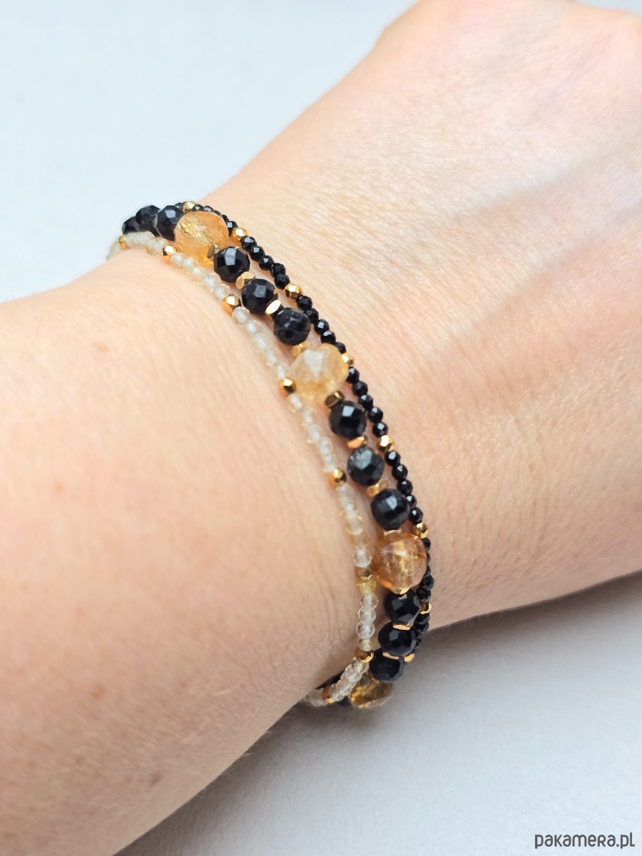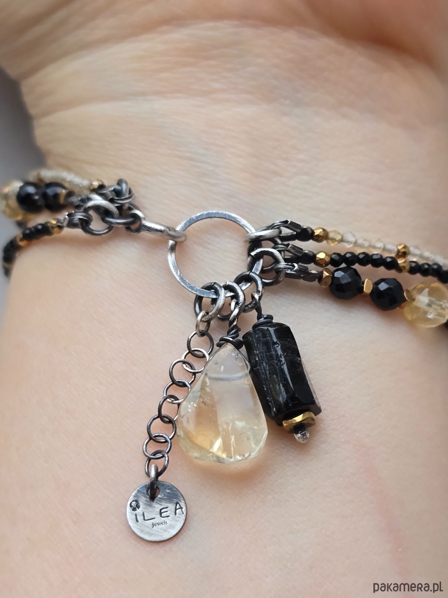 3 rzędowa bransoletka z zawieszkami, z kamieni naturalnych tj.: czarny turmalin, cytryn i złocony hematyt