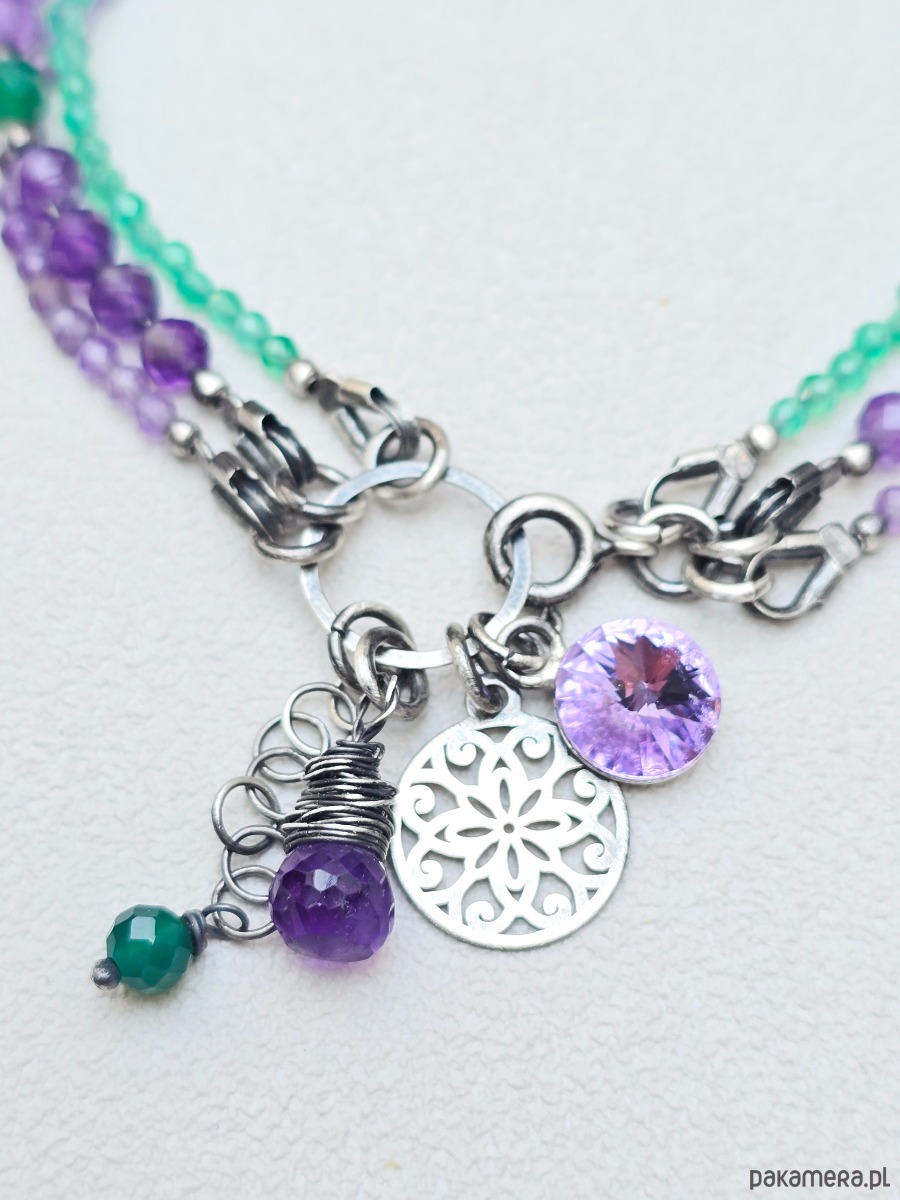 Potrójna bransoletka z trzema wyjątkowymi zawieszkami: kroplą ametystu, okrągłą z motywem rozetki i fioletowy kryształek Svarovskiego Rivioli
