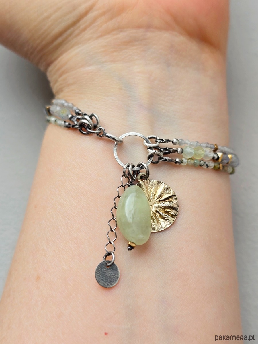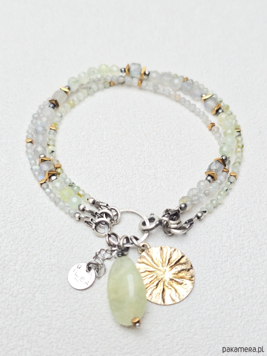 3 rzędowa bransoletka z kamieni naturalnych tj.: prehnit, labradoryt i złocony hematyt.