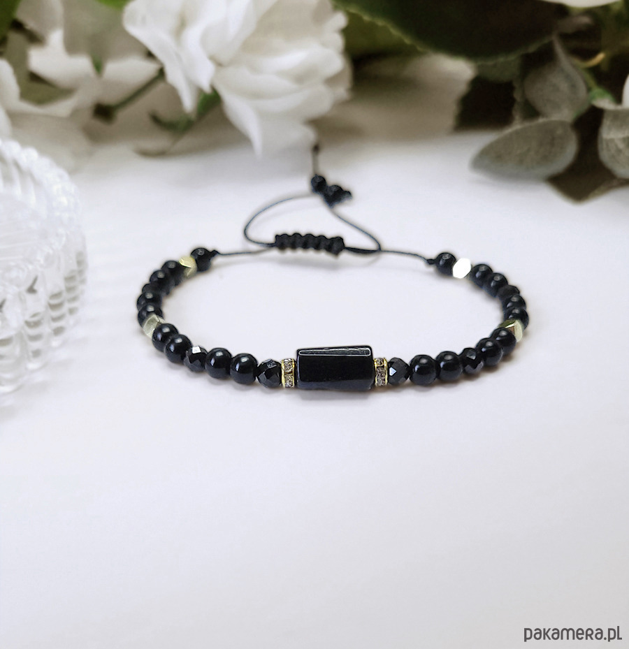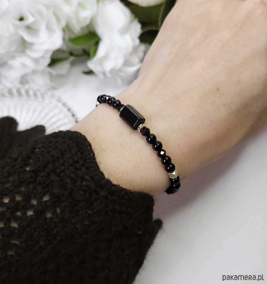Bransoletka zrobiona z kamieni naturalnych: Turmalinu czarnego (główny element), Onyksu, Spinelu oraz Hematytu w kolorze złota.
