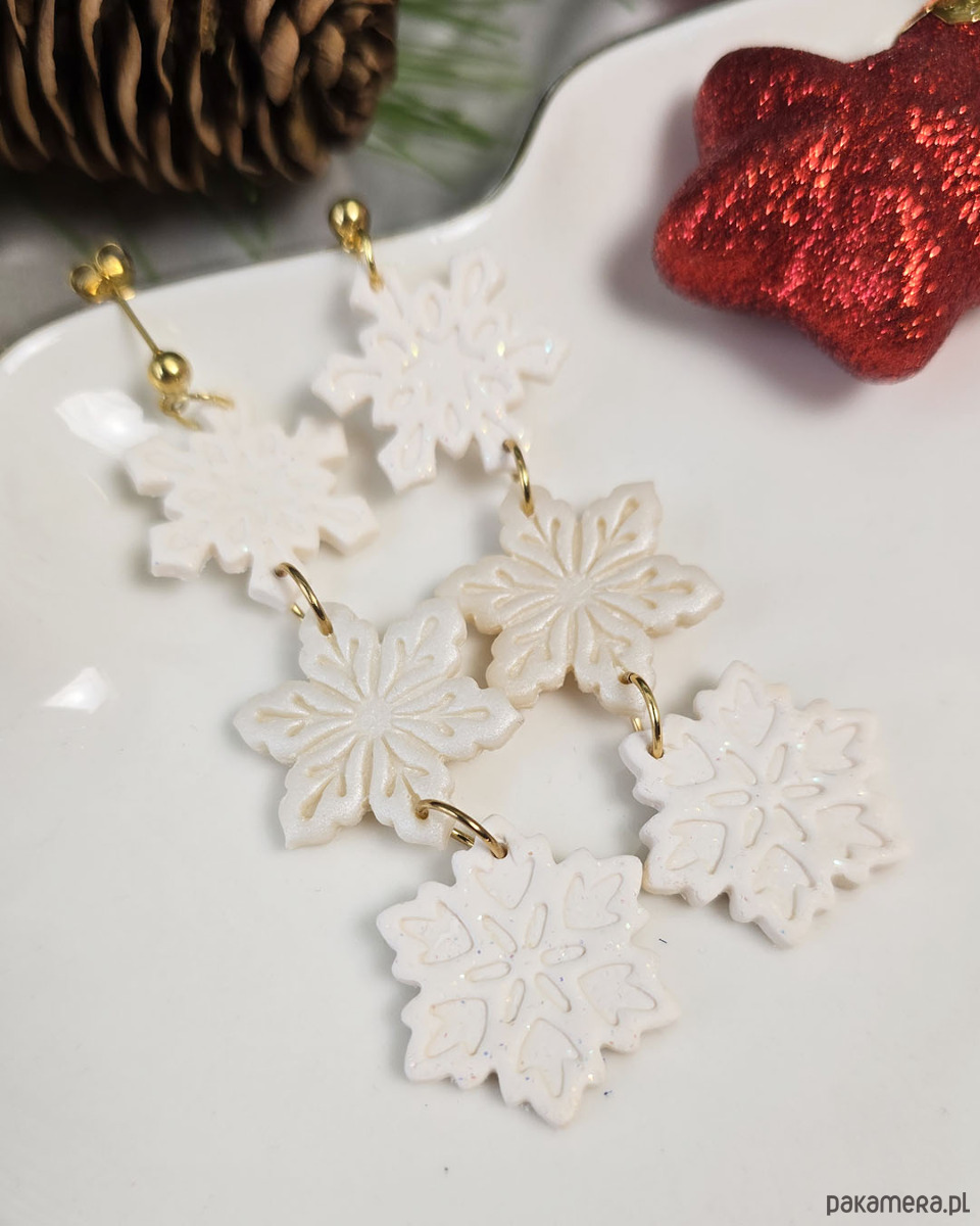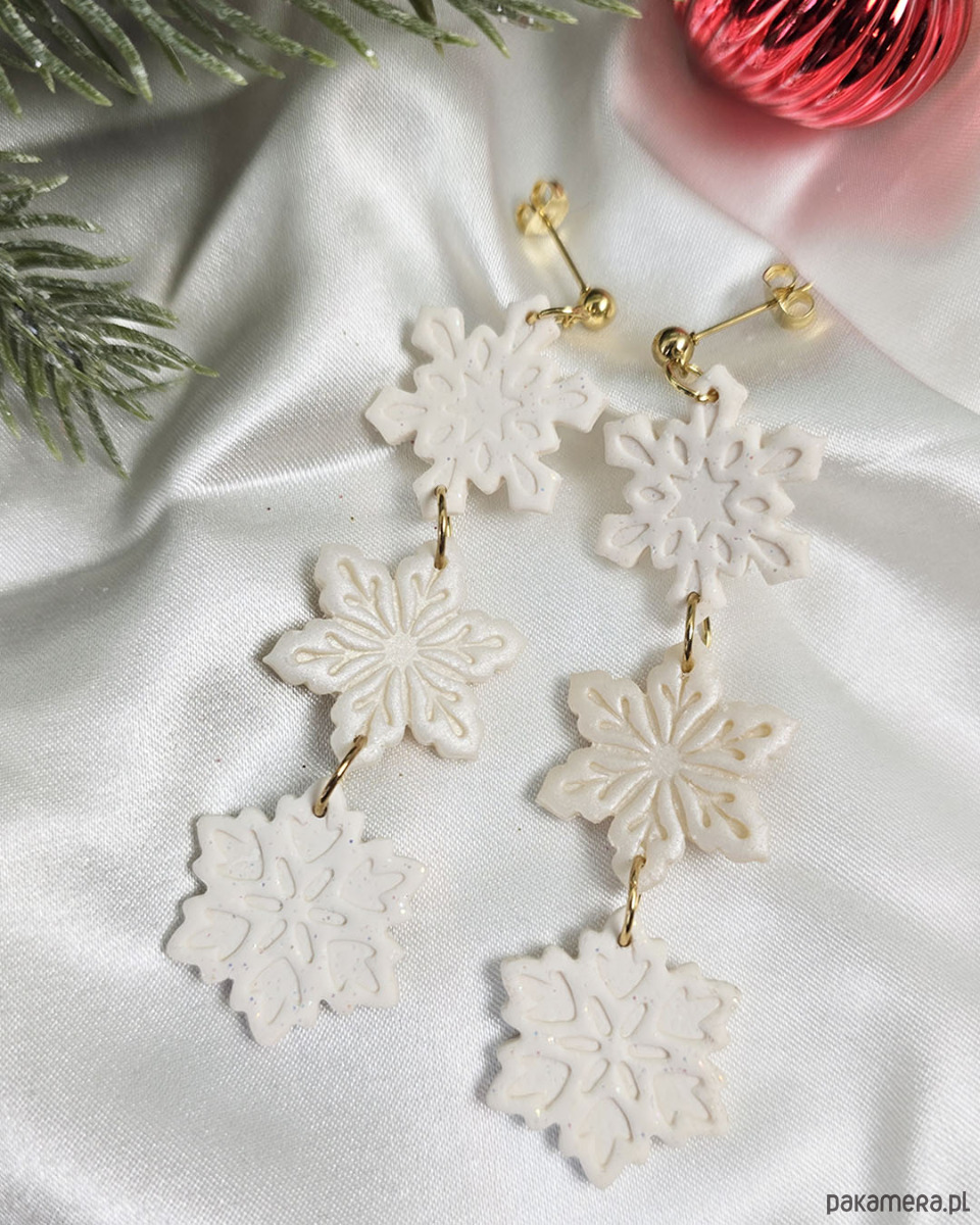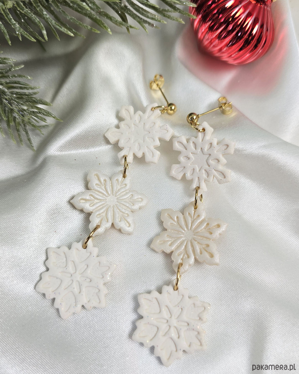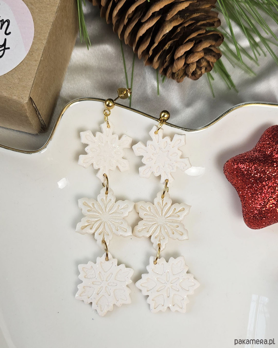 Całkowita długość kolczyków to około 8 cm, kolczyki mimo rozmiary są lekkie. Wszystki śnieżynki pięknie się błyszczą, mają w sobie brokat lub pyłek.