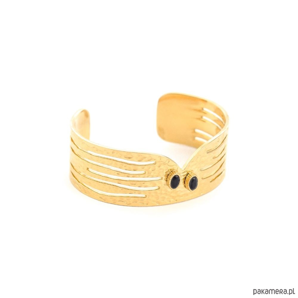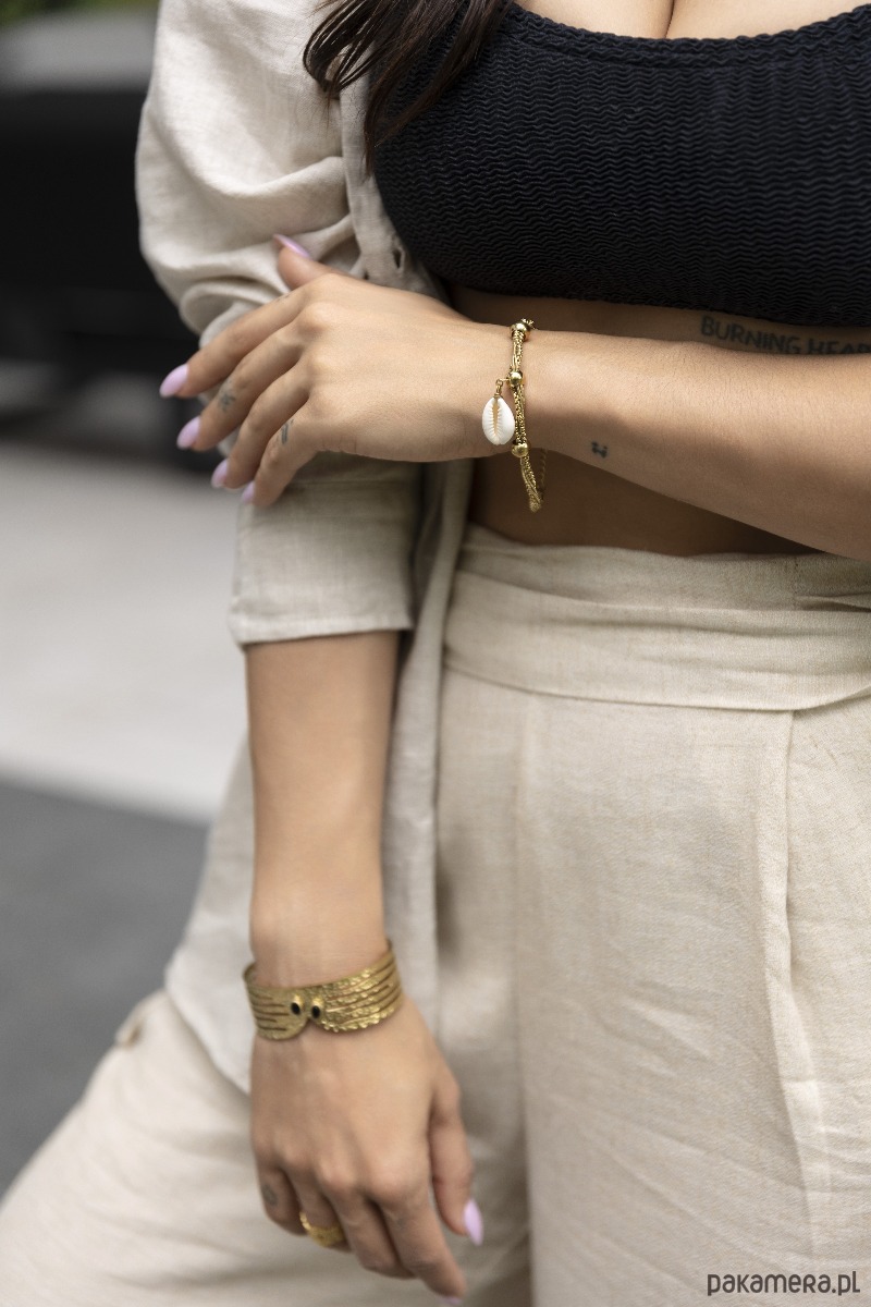 Bransoletka wykonana jest z antyalergicznej stali szlachetnej pozłacanej, która nie uczula. Bez obaw, pozłocenie pięknie się utrzymuje, nie ciemnieje i nie wyciera.Wymiary:Wysokość bransoletki: 1,8cmGrubość bransoletki: ok. 0,8mmMateriał: antyalergiczna stal szlachetna