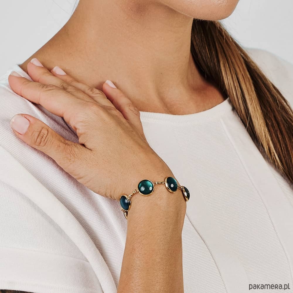 Ta pełna blasku bransoletka jest częścią kolekcji “W blasku perłowego księżyca”. Bransoletka wykonana jest z ręcznie malowanych kaboszonów umieszczonych w bazach ze stali szlachetnej. Szklane elementy zachwycają subtelnym, opalizującym blaskiem, który jest niczym odbicie księżyca na tafli wody. Bransoletka mieni się w świetle, przyciągając wzrok i dodając elegancji każdej stylizacji. Ten dodatek jest idealny dla osób ceniących sobie wyrafinowaną i ponadczasową biżuterię.