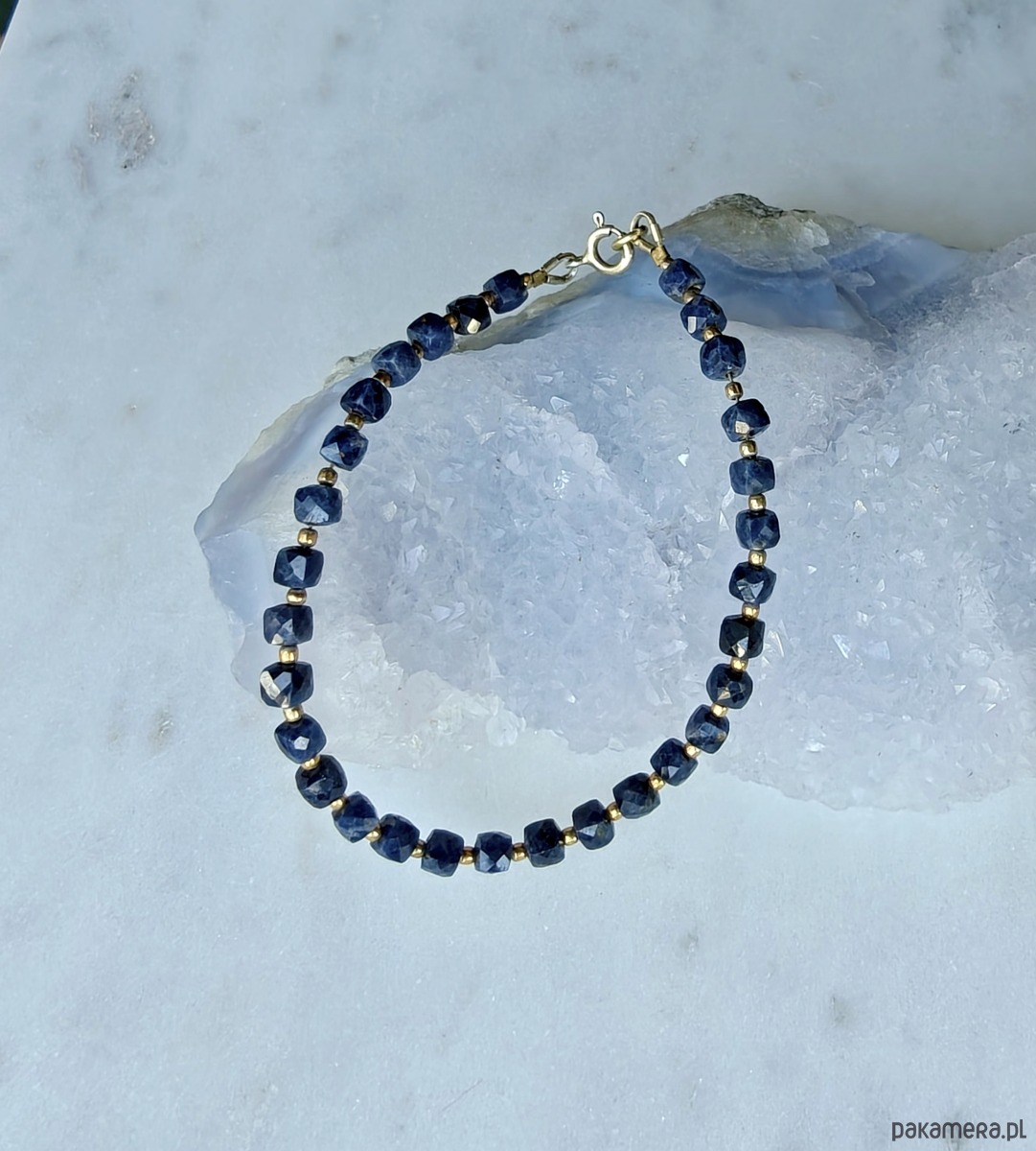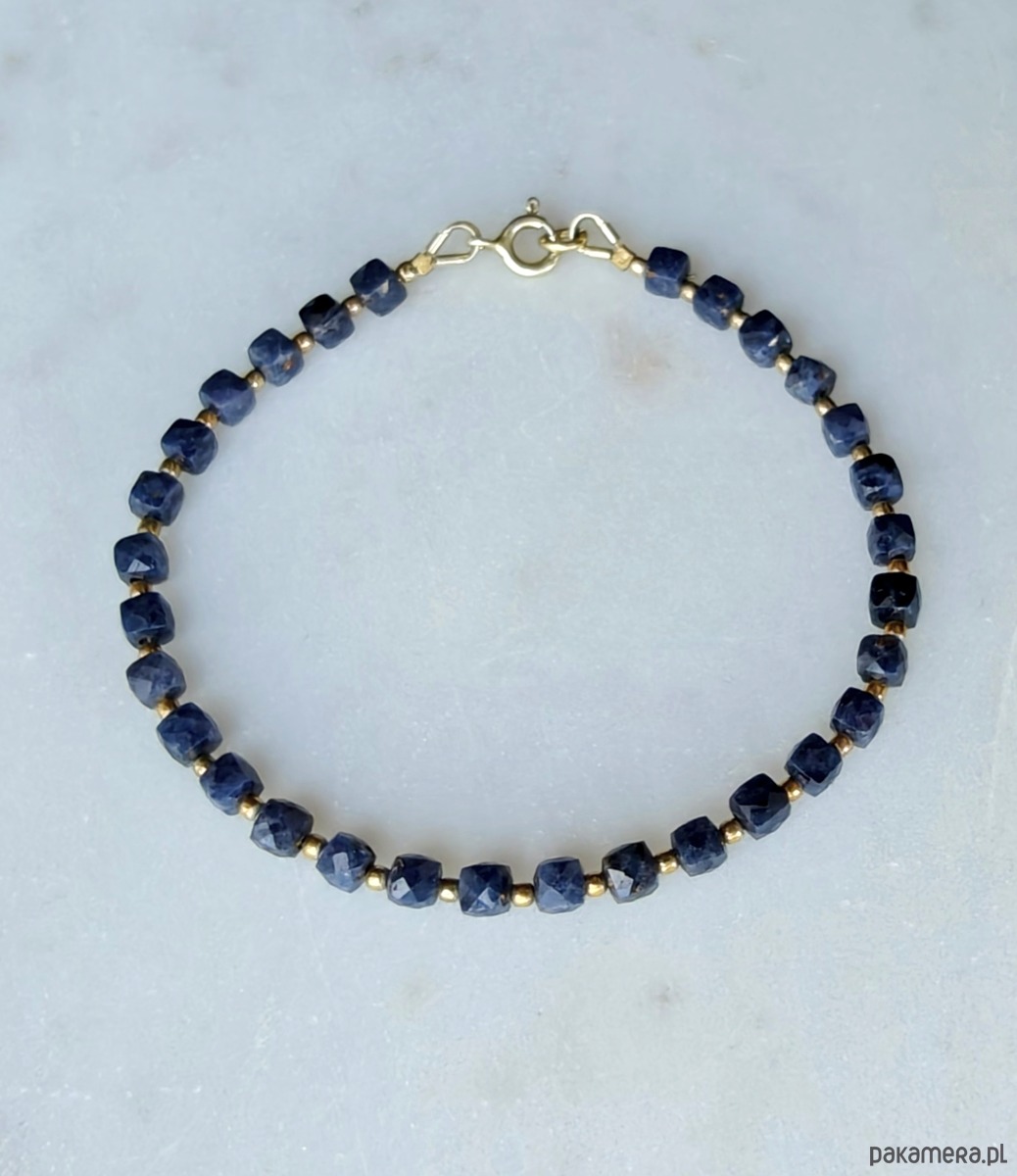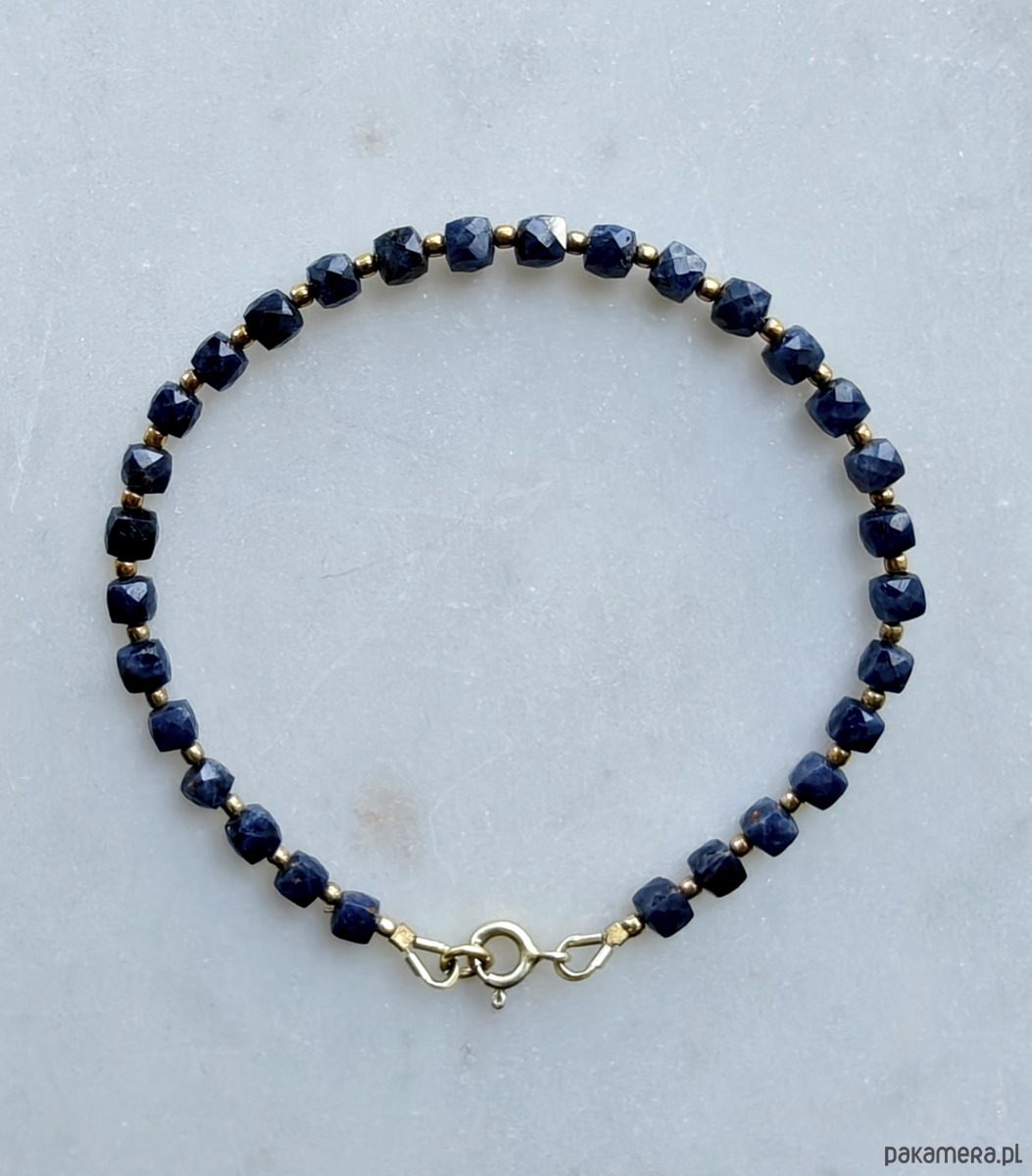 Minimalistyczna i efektowna bransoletka z błękitnych szafirów. Ich mocny kolor został przełamany pozłacanym srebrem. Kamienie pięknie odbijają światło i mienią się. Bransoletka jest delikatna, kobieca.