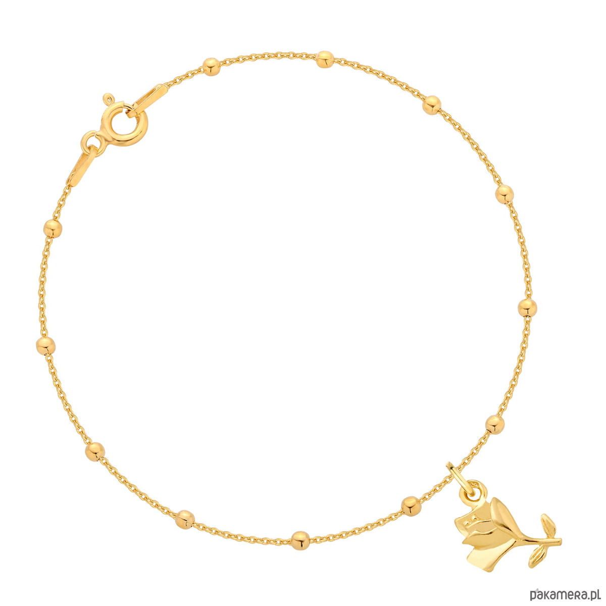 Bransoletka ze srebra próby 925 pozłacanego 24-karatowym złotem.Bransoletka została wykonana z łańcuszka oraz zawieszki w kształcie różyDługość bransoletki: uniwersalna 18 cmWielkość zawieszki: 15 mmBiżuterię pakujemy w ozdobne opakowanie jubilerskie.