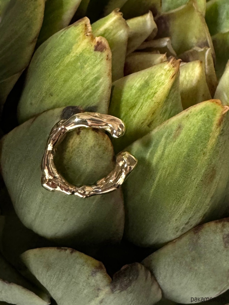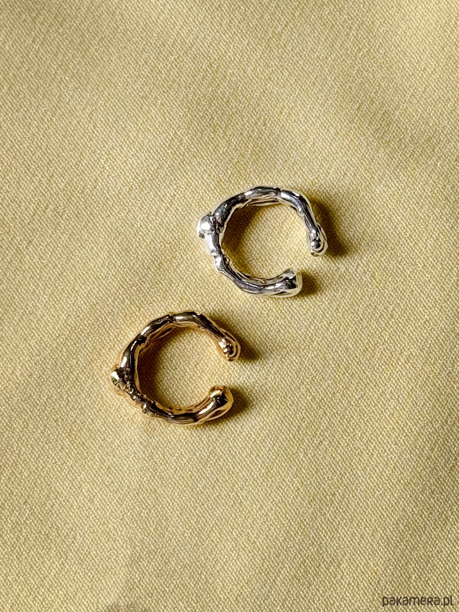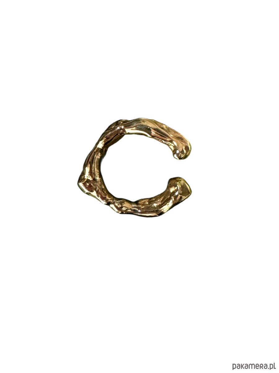 Nausznica o nieregularnym kształcie wykonana z pozlacanego srebra.