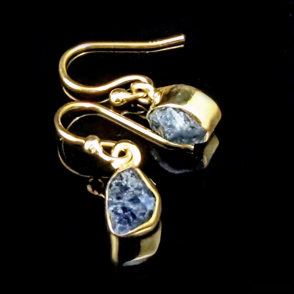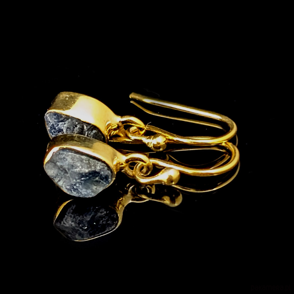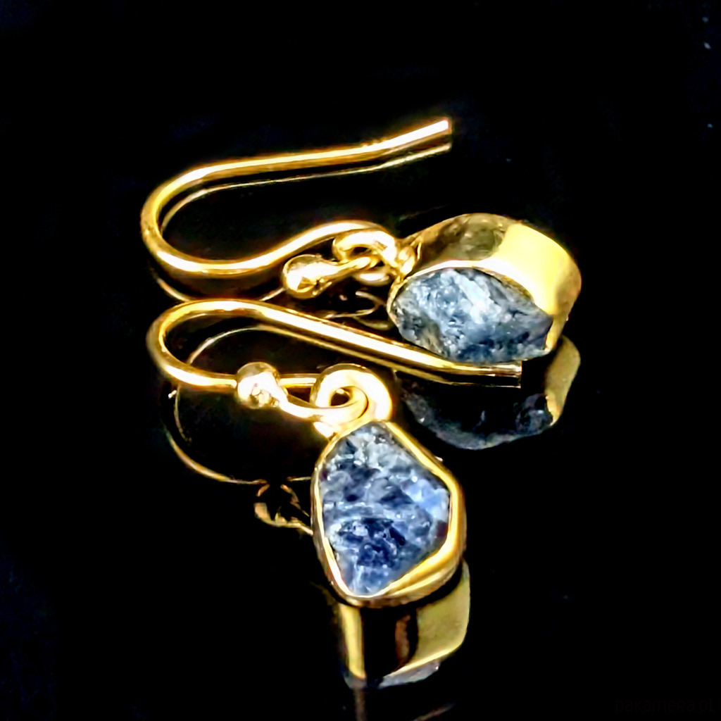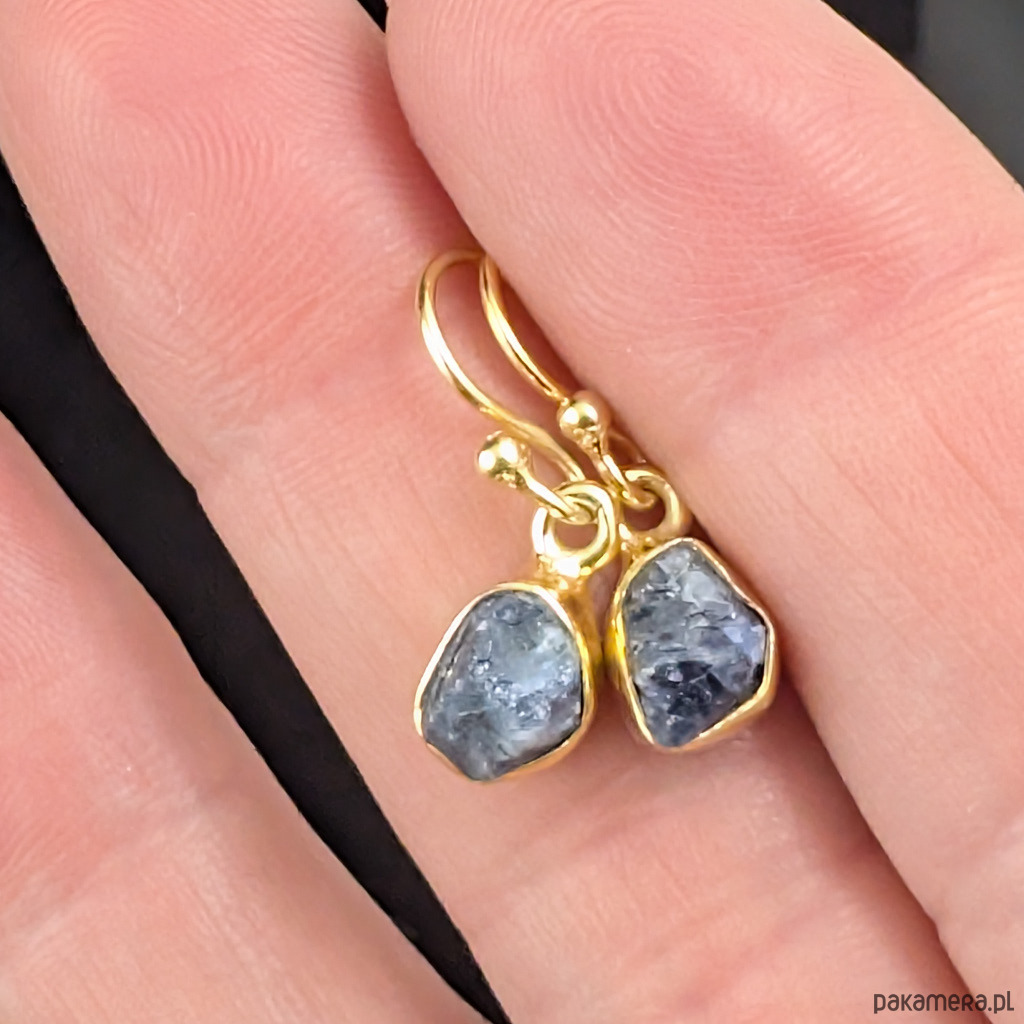 Kolczyki wykonane ze srebra 925 oraz surowych bryłek szafirów. Srebro zostało pozłocone, są to delikatne powłoki, które z czasem mogą się ścierać. Wymiary oprawy 7 x 5 mm. Waga jednego kolczyka 1 gram. Długość 21 mm. Bardzo oryginalne. Wykonane przez dostawcę kamieni, Kolczyki zostaną zapakowane w ozdobne pudełeczko.