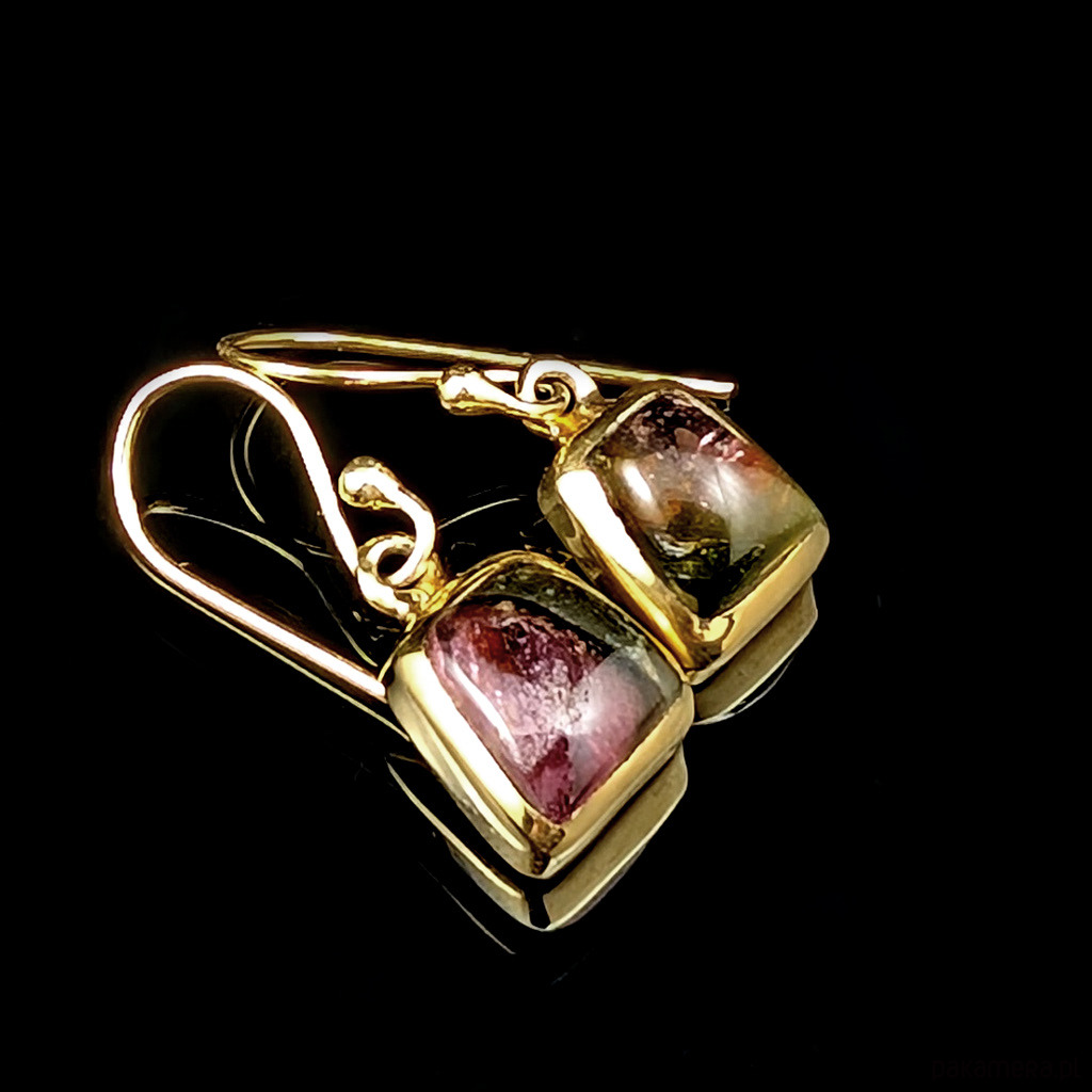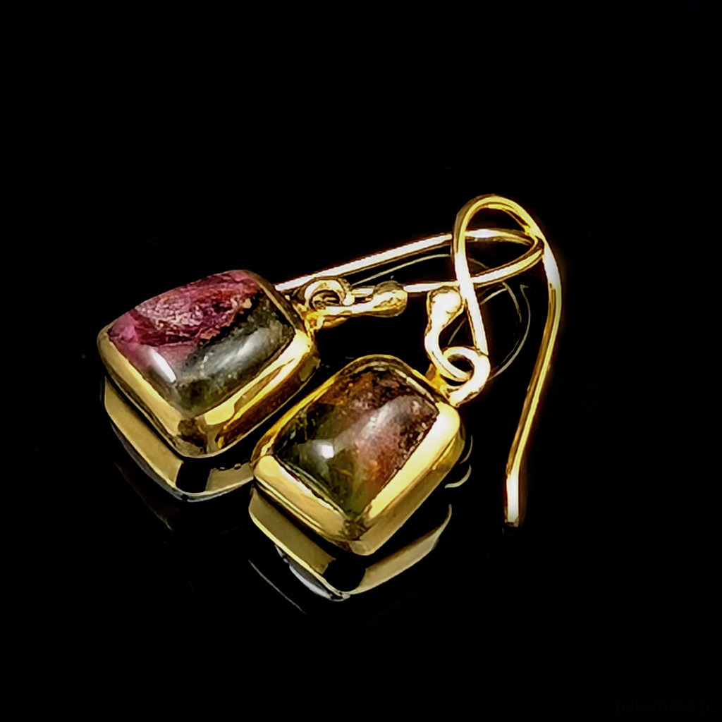 Eleganckie i nietuzinkowe kolczyki wykonane z pozłacanego srebra próby 925 oraz pieknych arbuzowych turmalinów. Wymiary całej oprawy 10 x 9 mm, długość z biglami 25 mm. Waga jednego kolczyka 1,8 grama. Złoconie wykonane jest bardzo delikatnie, z czasem może się ścierać. Wykonane przez dostawcę kamieni. Kolczyki zostaną wysłane w ozdobnym pudełeczko