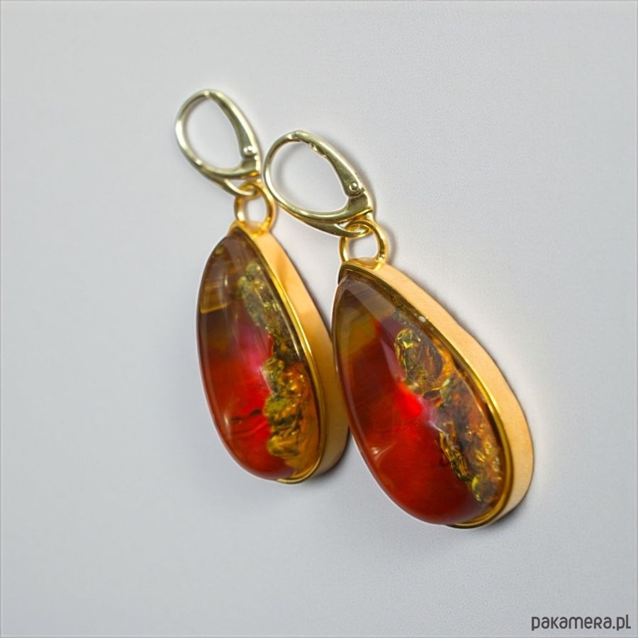 Te ręcznie wykonane kolczyki zachwycają intensywnym, głębokim odcieniem bursztynu, którego naturalna struktura pięknie współgra z elegancką, pozłacaną oprawą. Kształt bursztynu podkreślony jest 24-karatowym złotem, co dodaje całości luksusowego charakteru. Dzięki swojej długości kolczyki prezentują się niezwykle efektownie i stanowią wyjątkową ozdobę na każdą okazję.