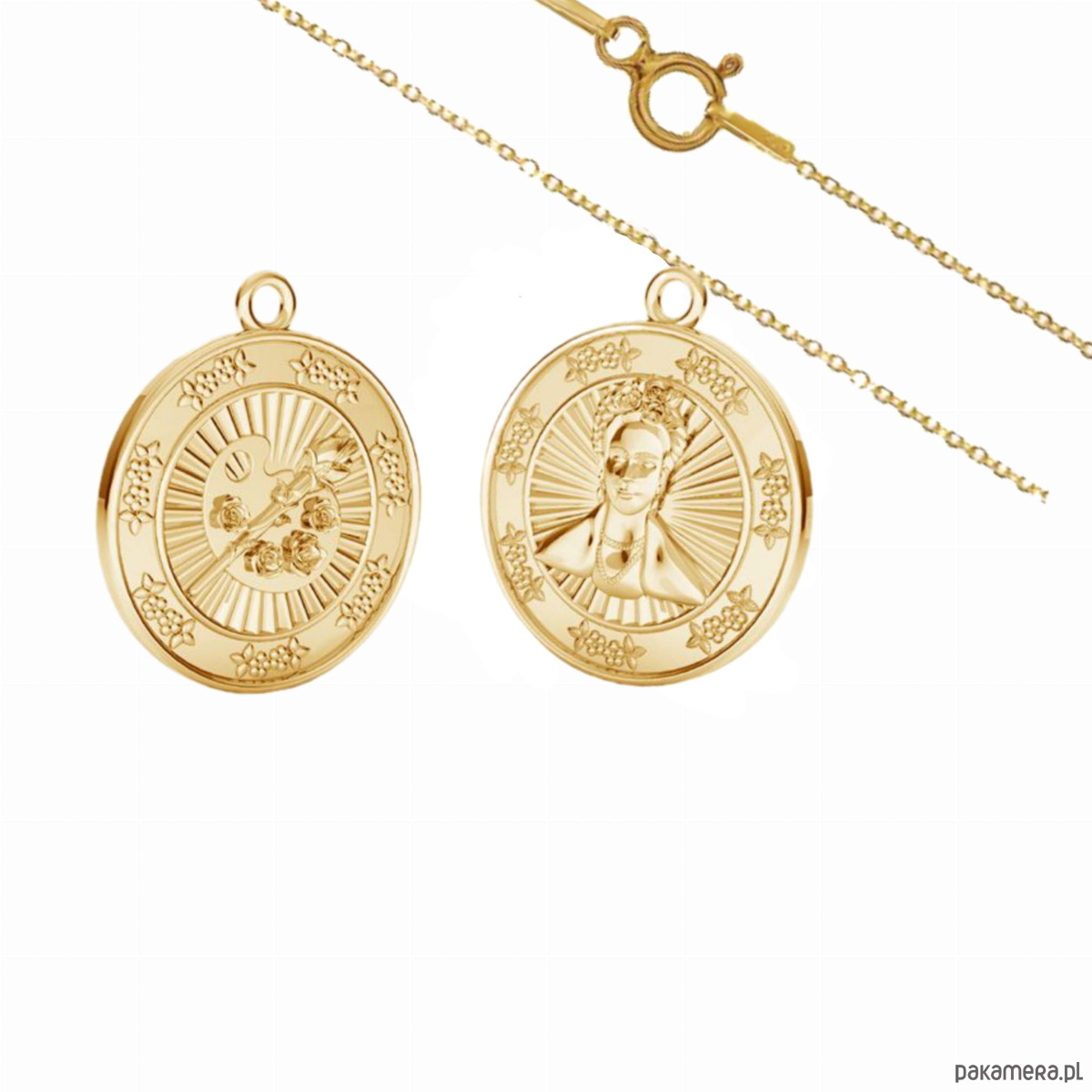 Łańcuszek oraz wisiorek moneta z wizerunkiem Fridy Khalo - każda moneta oraz łańcuszek zostały wykonane ze srebra 925 i delikatnie pokryte 18-karatowym złotem.