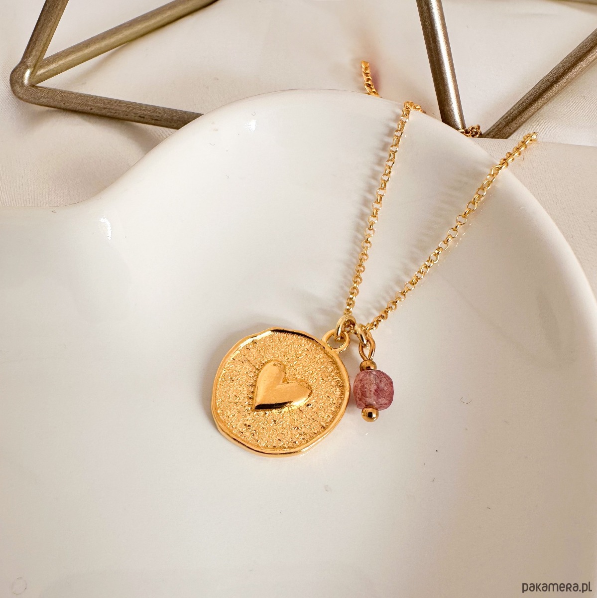 Pozłacany naszyjnik- blaszka z sercem i kwarcem różowym