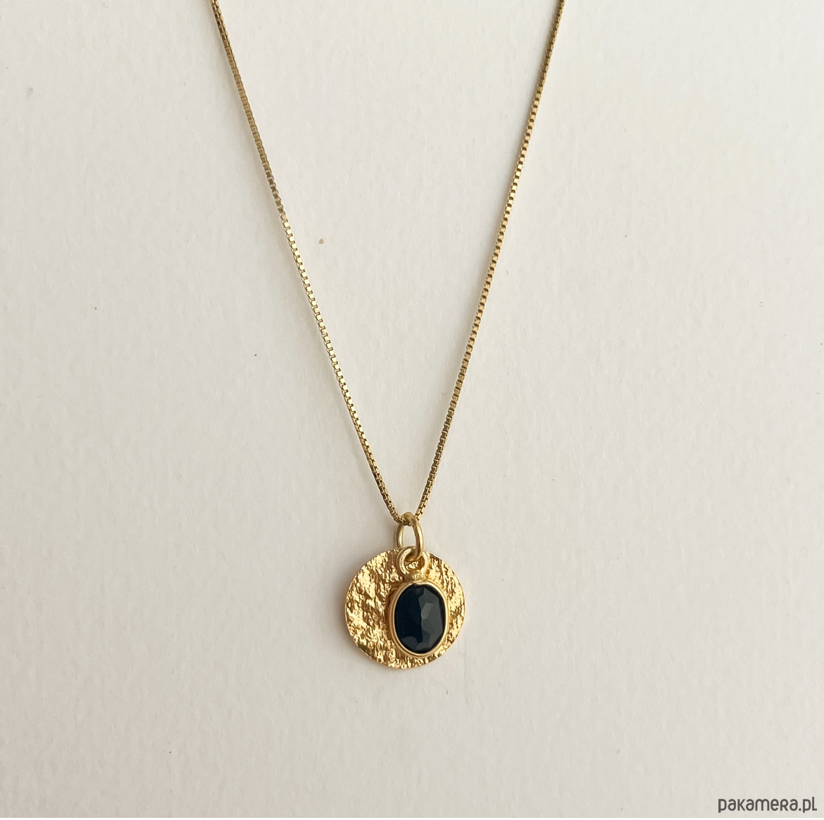 Cieniutki pozłacany naszyjnik TORRI z pozłacaną zawieszka w kształcie młotkowaną blaszką 13 cm oraz czarnym turmalinem w pozłacanym okuciu .   .