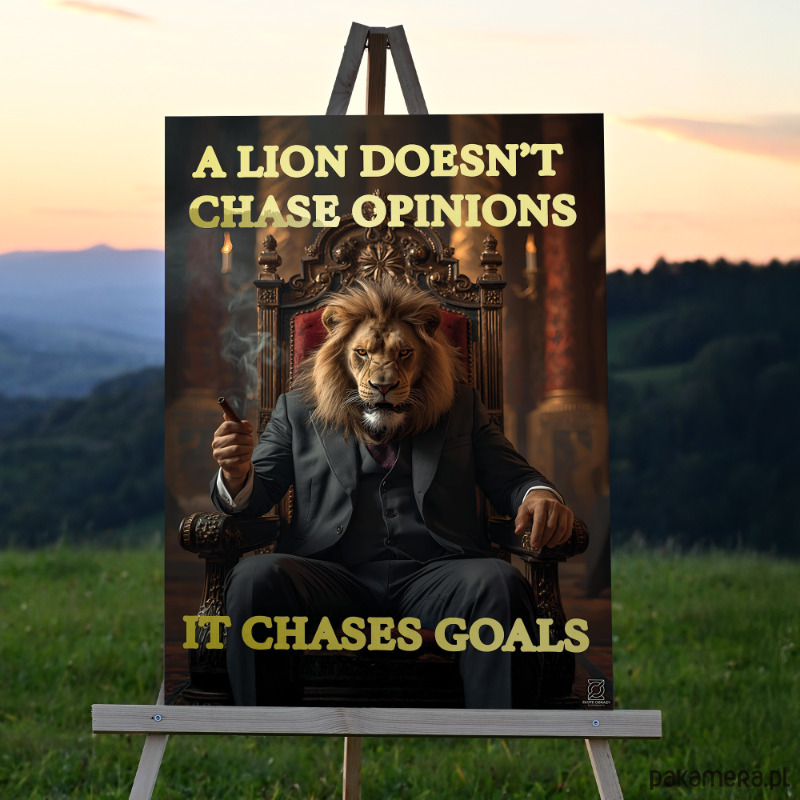 Podnieś estetykę swojego wnętrza dzięki temu wyjątkowemu obrazowi na płótnie, przedstawiającemu majestatycznego lwa w garniturze z palącym się cygarem w ręce. Inspirujący napis „A LION DOESNT CHASE OPTIONS, IT CHASE GOALS” (możliwość personalizacji napisu) motywuje do działania, wykonany ręcznie za pomocą złotej folii dla luksusowego efektu. Ten wysokiej jakości drukowany obraz na płótnie idealnie nadaje się do dodania elegancji i motywacji do każdego pomieszczenia. Ten oryginalny projekt został wydrukowany na wysokiej jakości płótnie, a napisy w złotej kolorystyce zostały precyzyjnie wykonane ręcznie za pomocą złotej folii.