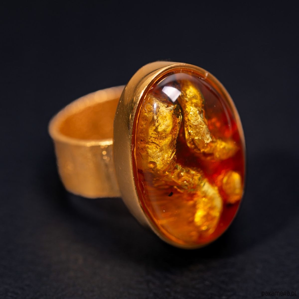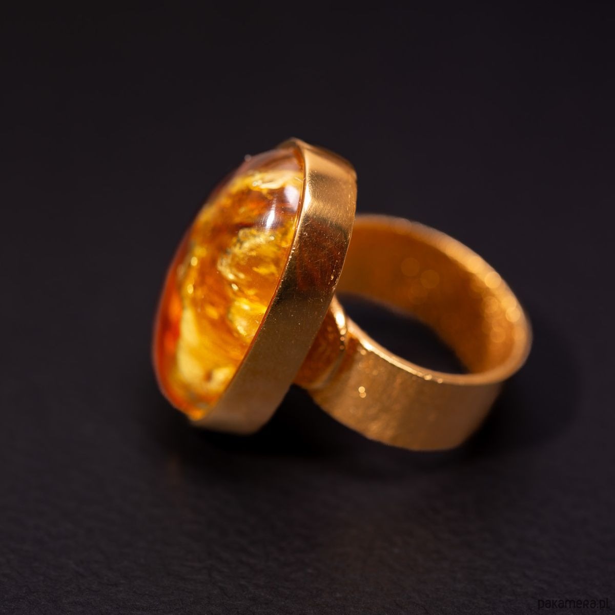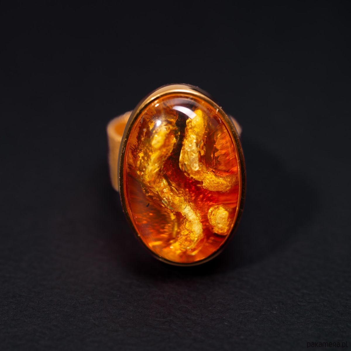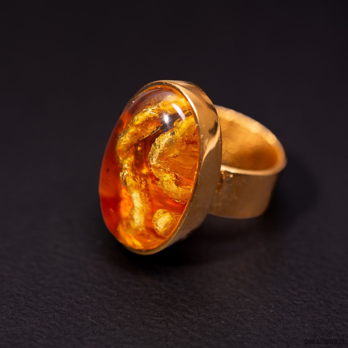 Pierścionek, który przyciąga wzrok od pierwszej chwili. Gładko wypolerowany, wypukły bursztyn odsłania subtelne inkluzje i miękką grę światła, a jego soczysta, miodowo‑pomarańczowa barwa pięknie łączy się z ciepłem złota. Ręczna oprawa ze srebra próby 925, pozłocona 24‑karatowym złotem, otula bursztyn z wyczuciem, nadając całości elegancję i wyrafinowany charakter. To biżuteria, która świetnie prezentuje się zarówno w codziennym rytmie, jak i wieczorem — wyrazista, szlachetna, z klasą.