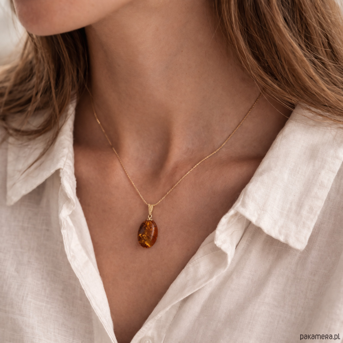 Ręcznie wykonany naszyjnik z naturalnym bursztynem bałtyckim, osadzonym w pozłacanym srebrze. Elegancki, owalny kamień w kolorze koniaku (wymiary ok. 19 x 13 mm) podkreślony jest subtelną oprawą ze srebra próby 925, pokrytą warstwą żółtego złota. Kompozycja łączy ciepły, organiczny wygląd bursztynu z klasycznym blaskiem pozłacanego srebra, tworząc uniwersalną biżuterię odpowiednią na co dzień i na wyjątkowe okazje.