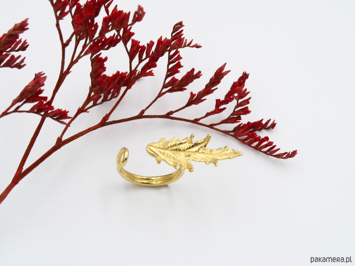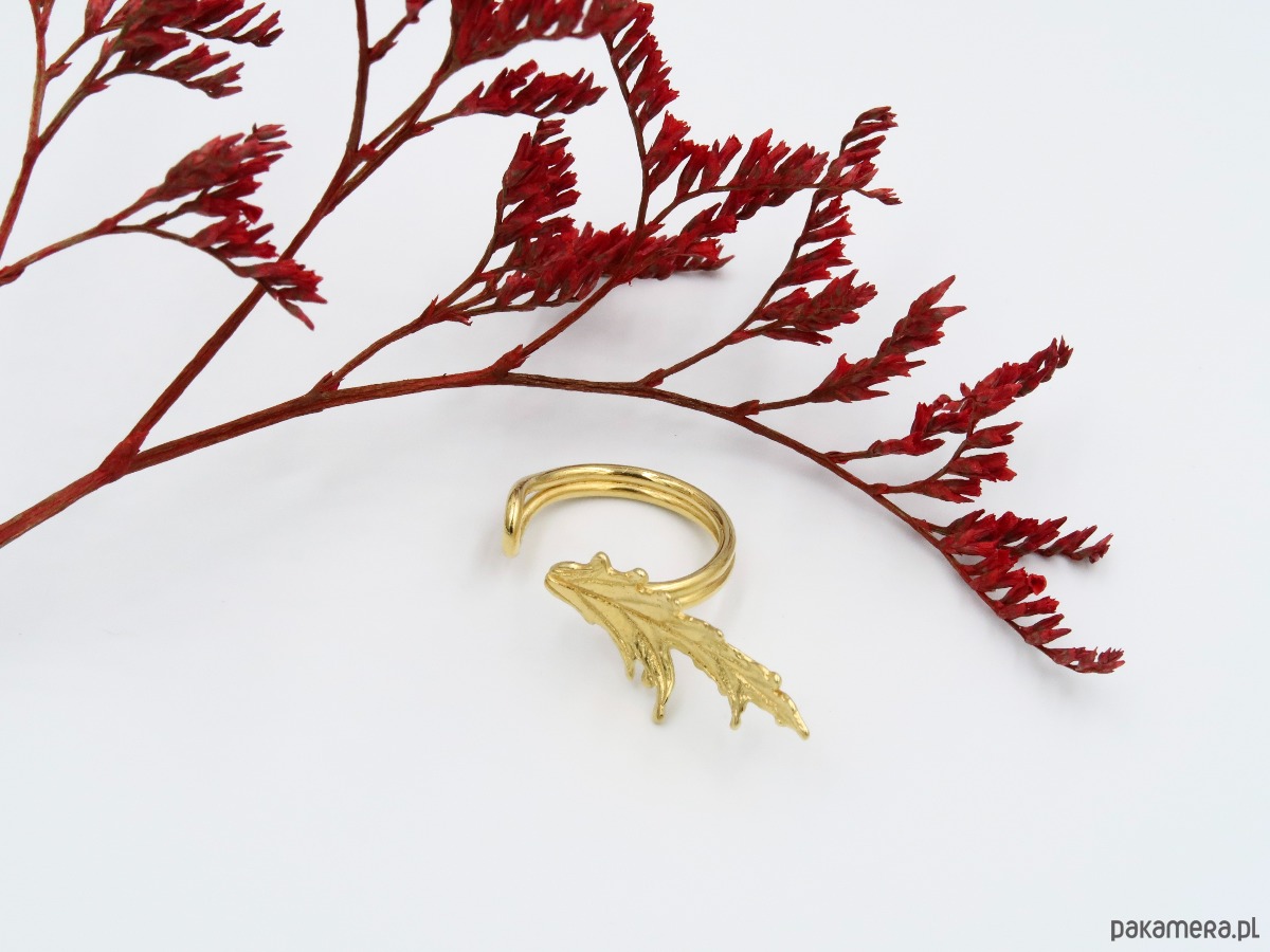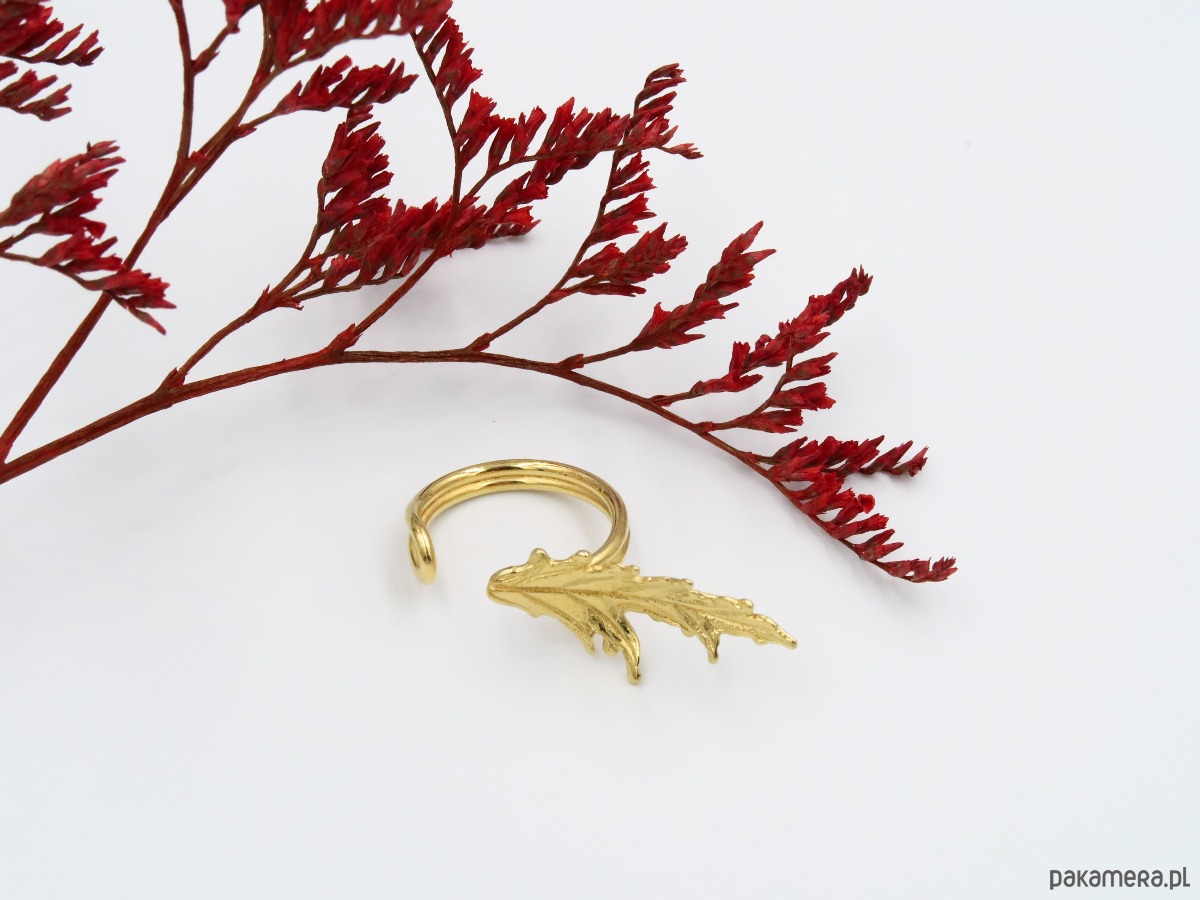 Artystyczny pierścionek z regulowaną, otwartą obrączką, z kolekcji Kwiatostan, powstałej z wykorzystaniem prawdziwych roślin.