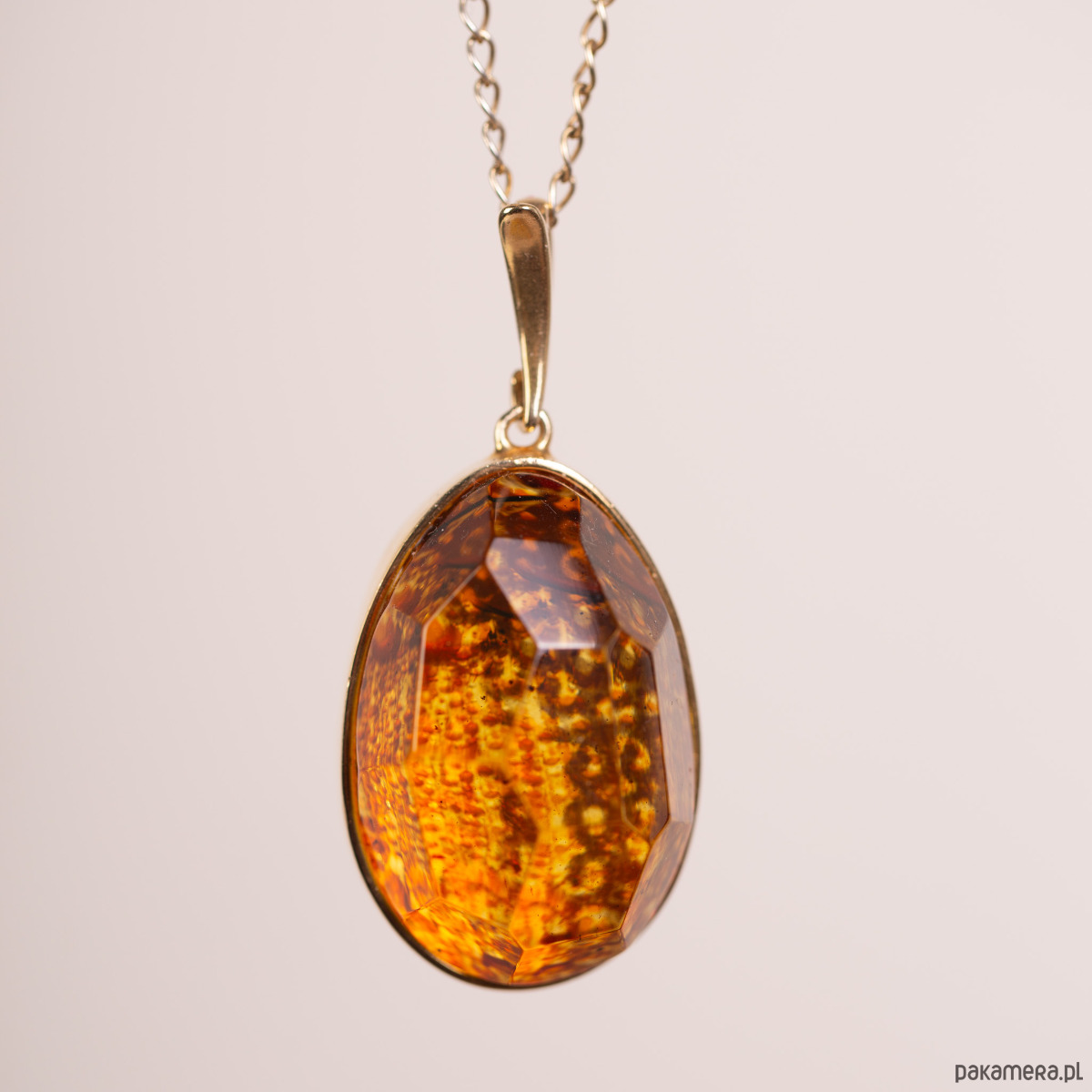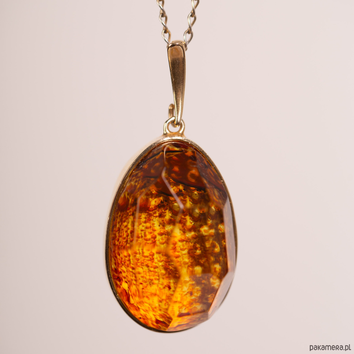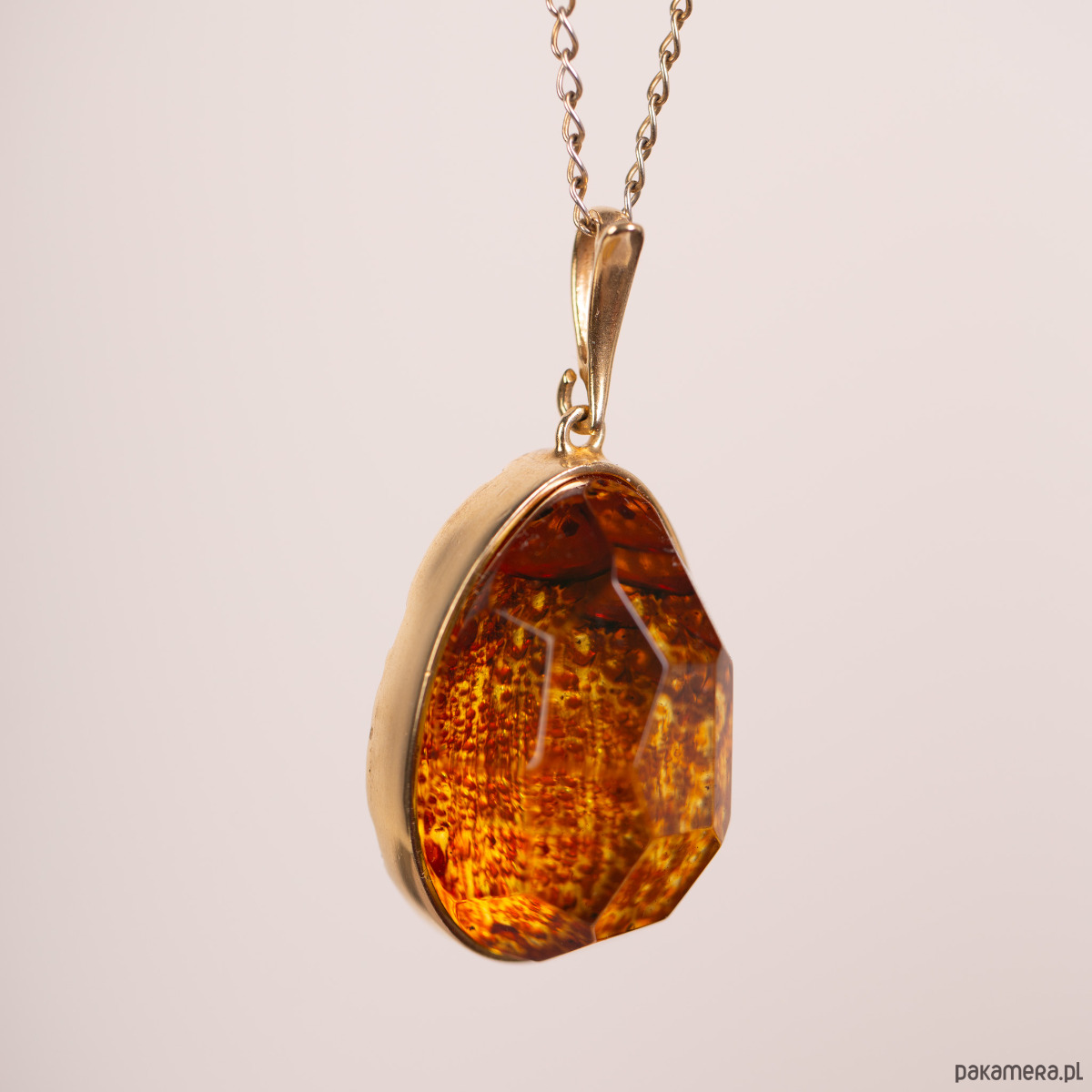 Spektakularny wisiorek z naturalnym bursztynem bałtyckim, którego powierzchnia została poddana precyzyjnemu fasetowaniu. Liczne płaszczyzny szlifu sprawiają, że bursztyn o głębokim, miodowym odcieniu wyjątkowo intensywnie załamuje światło, lśniąc przy każdym ruchu. Oprawa ze srebra pozłacanego 24-karatowym złotem nadaje całości luksusowego, ciepłego wykończenia.