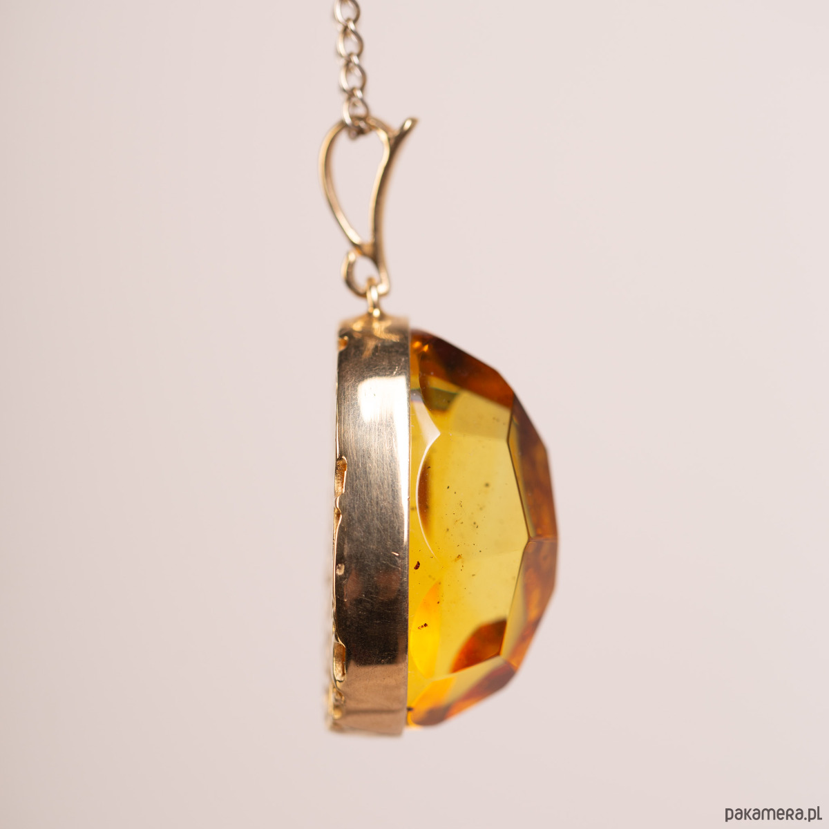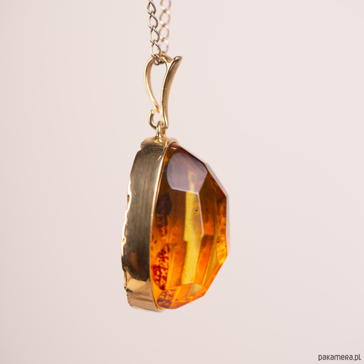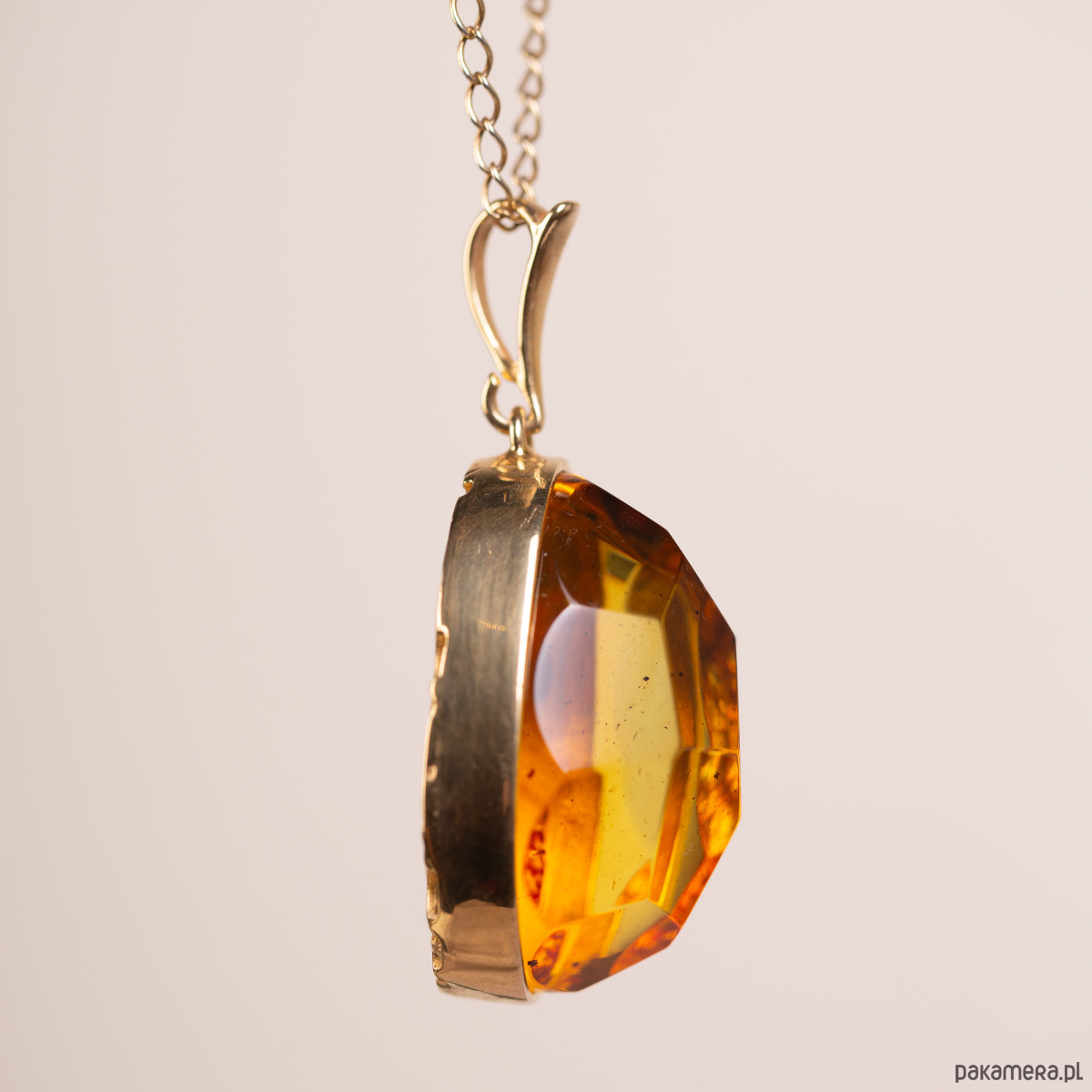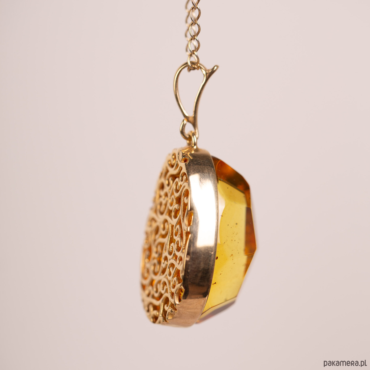 Spektakularny wisiorek z naturalnym bursztynem bałtyckim, którego powierzchnia została poddana precyzyjnemu fasetowaniu. Liczne płaszczyzny szlifu sprawiają, że bursztyn o głębokim, miodowym odcieniu wyjątkowo intensywnie załamuje światło, lśniąc przy każdym ruchu. Oprawa ze srebra pozłacanego 24-karatowym złotem nadaje całości luksusowego, ciepłego wykończenia.
